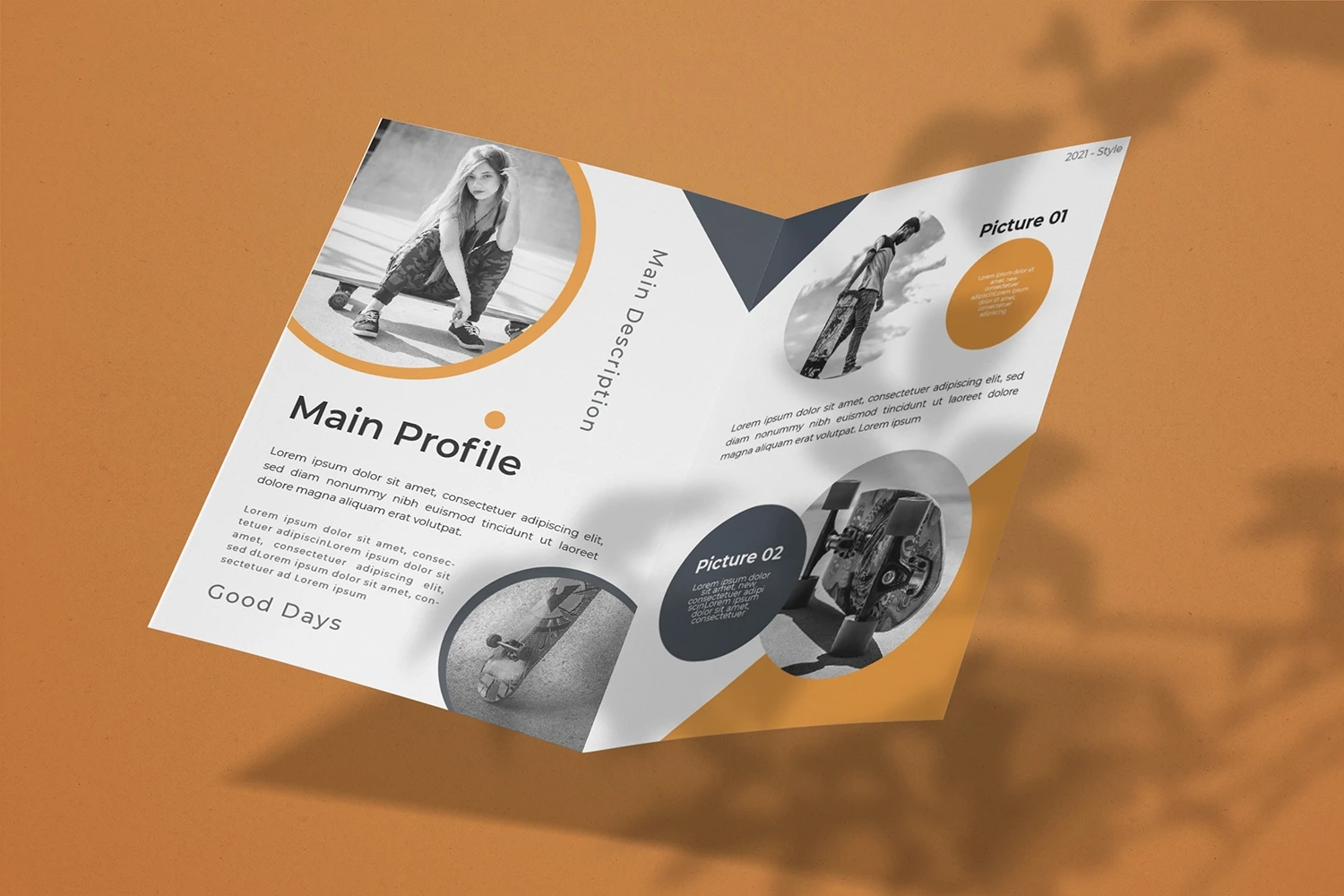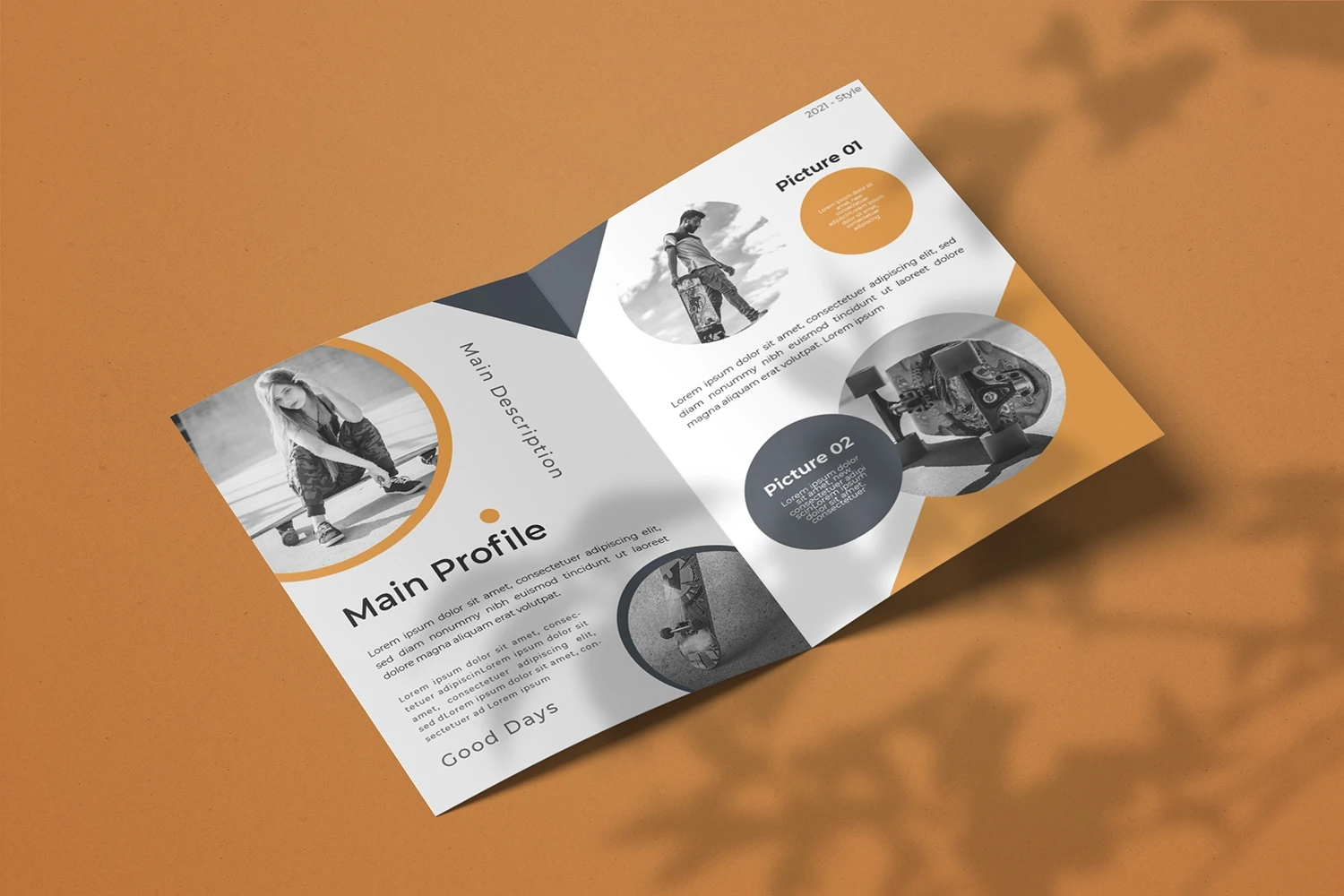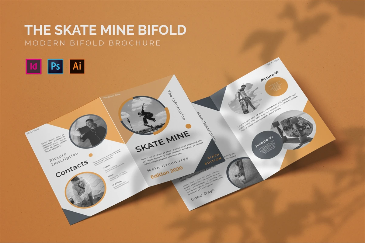 Skate Mine - Bifold Brochure We present this Bifold Brochure for you, simple and very elegant, and this Bifold Brochure is suitable for all types of your business, made with Adobe InDesign (INDD), Adobe Photoshop (PSD) and Adobe Illustrator (AI), very easy to customize, Hope you Like it, dont forget to rate, Thanks.