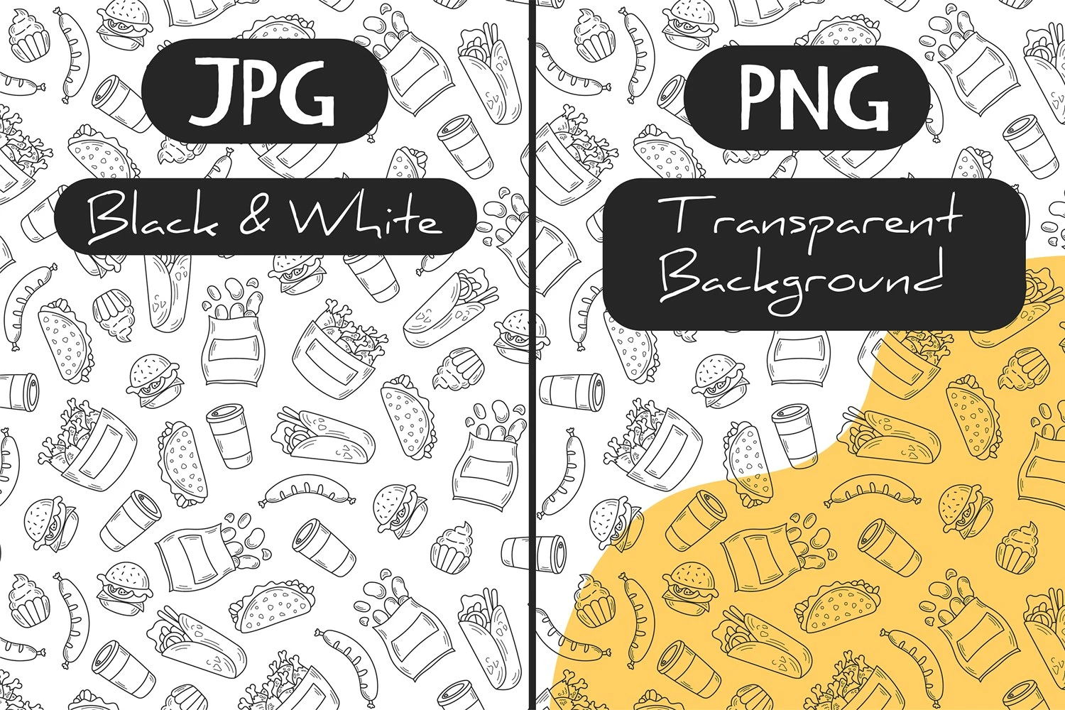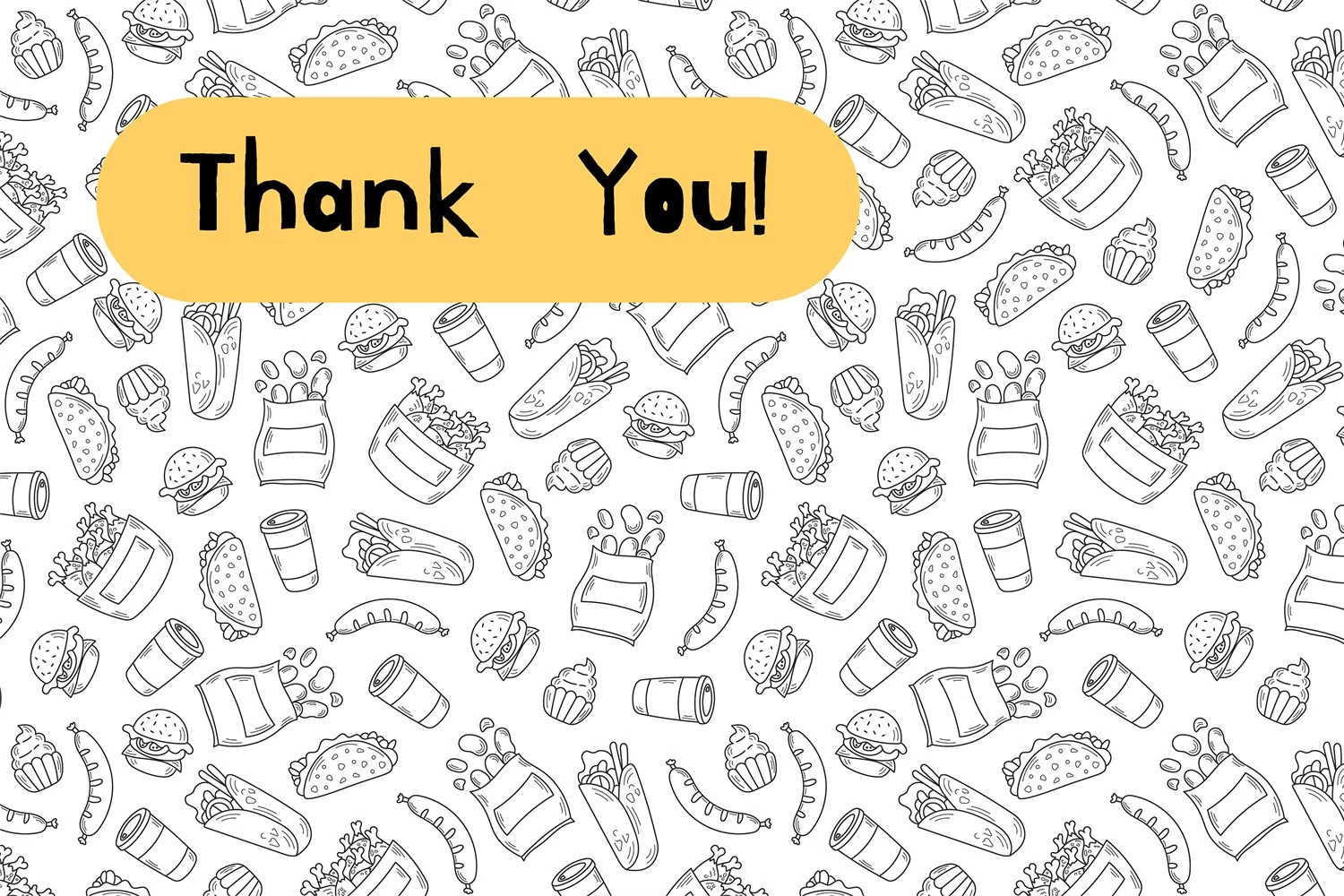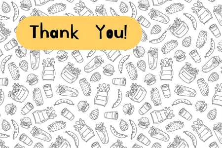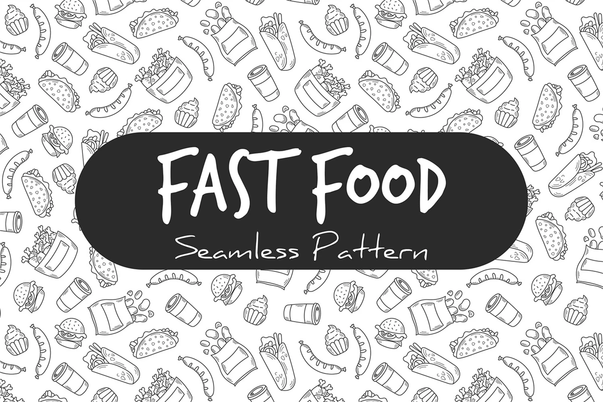Doodle style endless background with falling hand drawn fast food elements: burger, taco, burrito, coffee, fried chicken. Black line art vector illustration for restaurant, delivery, menu, wrapping and packaging paper, kitchen, textile, fabric, surface design.