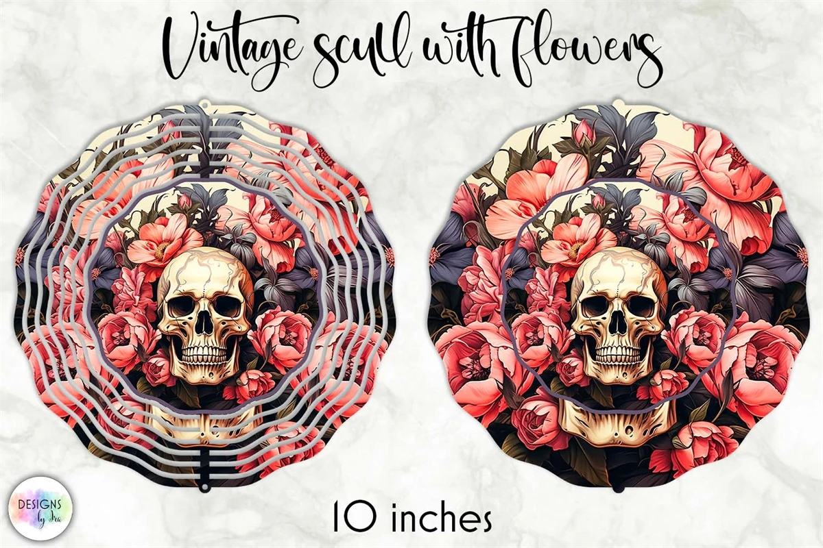 VINTAGE SCULL WITH FLOWERS WIND SPINNER.