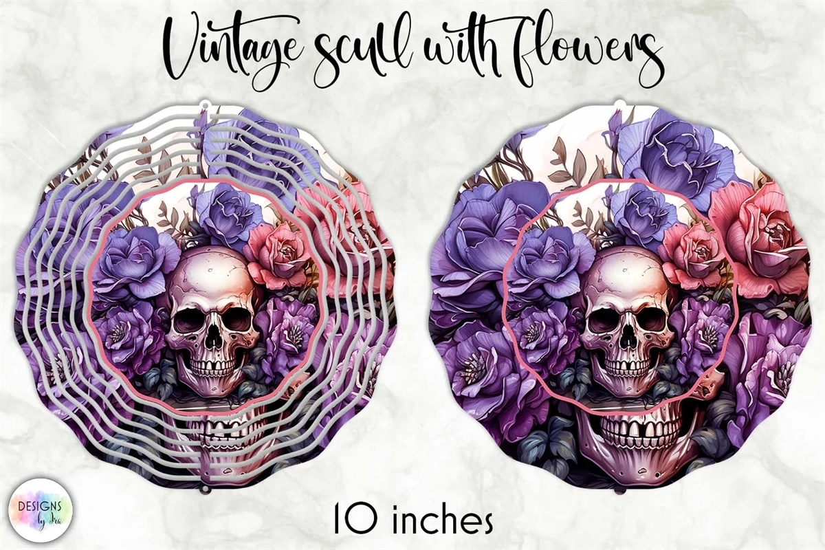 VINTAGE SCULL WITH FLOWERS WIND SPINNER.