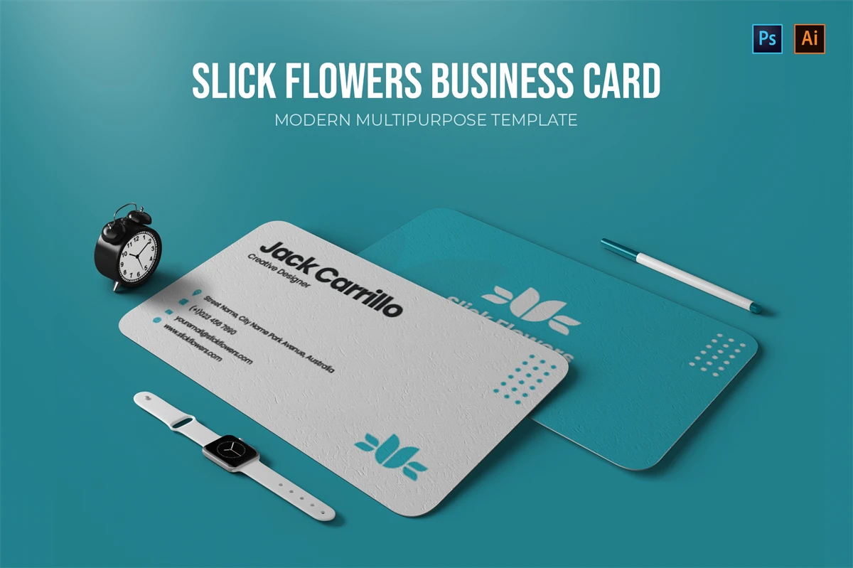 This Slick Flowers - Business Card make your business cards look professional. You can use this business card for, identity, company business cards, Corporate Business, Creative, Blogs, Photographers, Artists, Designers, etc.