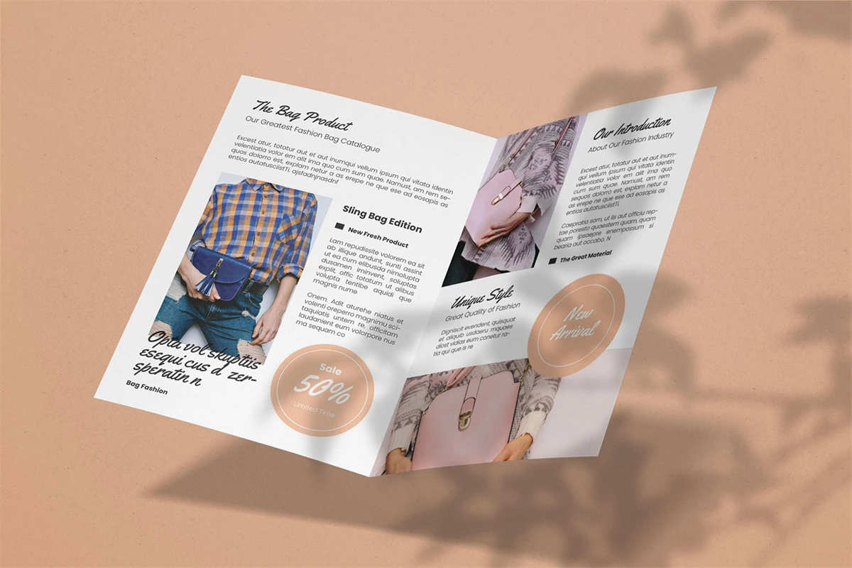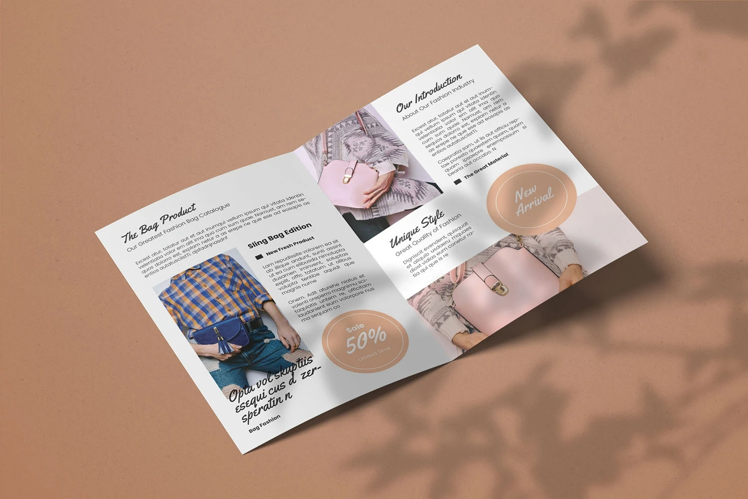 Sling Bag - Bifold Brochure We present this Bifold Brochure for you, simple and very elegant, and this Bifold Brochure is suitable for all types of your business, made with adobe inDesign, very easy to customize, Hope you Like it, dont forget to rate, Thanks.