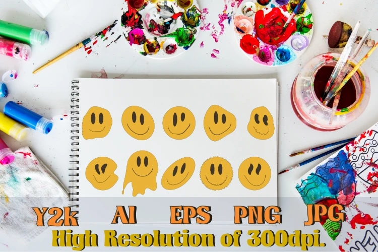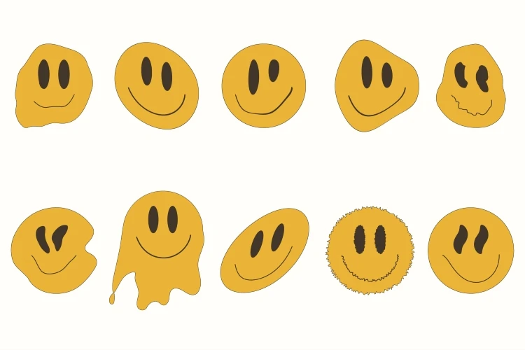 Psychedelic Smiles.Y2K collection.Sticker pack.Cartoon style. Retro y2k style.Vector set of design elements.Retro elements.Retro aesthetic y2k.Sticker set in y2k style.Designs for packaging.2000 years.Vector illustration of y2k.Nostalgia for 1980s.2000s