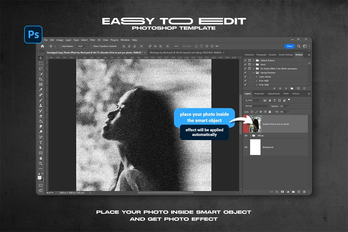 Introducing the "Smudged Copy Photo Effect" PSD template, a high-resolution (3000x2000 px) resource designed to give your photos an authentic, handcrafted look. This template offers easy customization through smart object replacement, allowing you to effortlessly apply the smudged copy effect to your images. Perfect for adding a unique and artistic touch to your photographs, this template is ideal for photographers, designers, and anyone looking to enhance their visual projects with a creative twist.