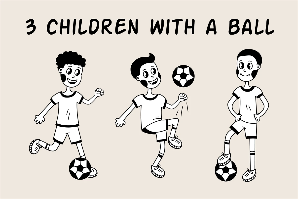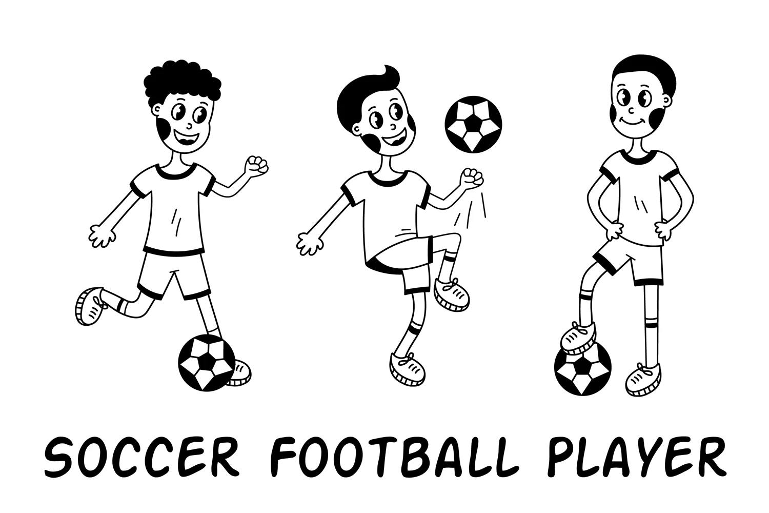 Child football or soccer player in cartoon doodle style. Black and white sports vector illustration. Comic character, mascot. Boy with a ball. Childish team sport concept design.