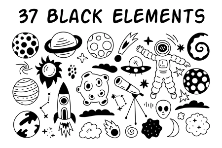 Space design elements. Hand-drawn astronomy and universe clipart in cartoon doodle style. Black line art planets, stars, telescope, astronaut, Flying saucer, alien. Ink drawn design for kids, products, greeting card, poster, invitation, marketing, etc. Vector illustration.