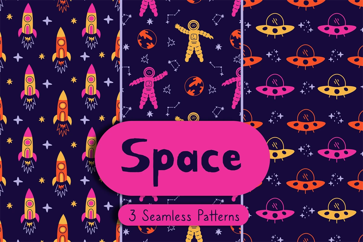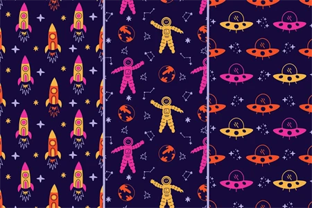 Modern colorful space seamless patterns with funny rocket, cosmonaut, astronaut, planets, stars, flying saucer and aliens on dark night backgrounds. Collection of galaxy digital papers in cartoon doodle style. Universe endless backgrounds with celestial cosmic elements are perfect for kids, astronomy, outer space exploration, galaxy traveling, fantastic and futuristic adventure themes< scrapbooking, junkbooking, decoupage, textile, fabric, wrapping paper, greeting cards, etc.
