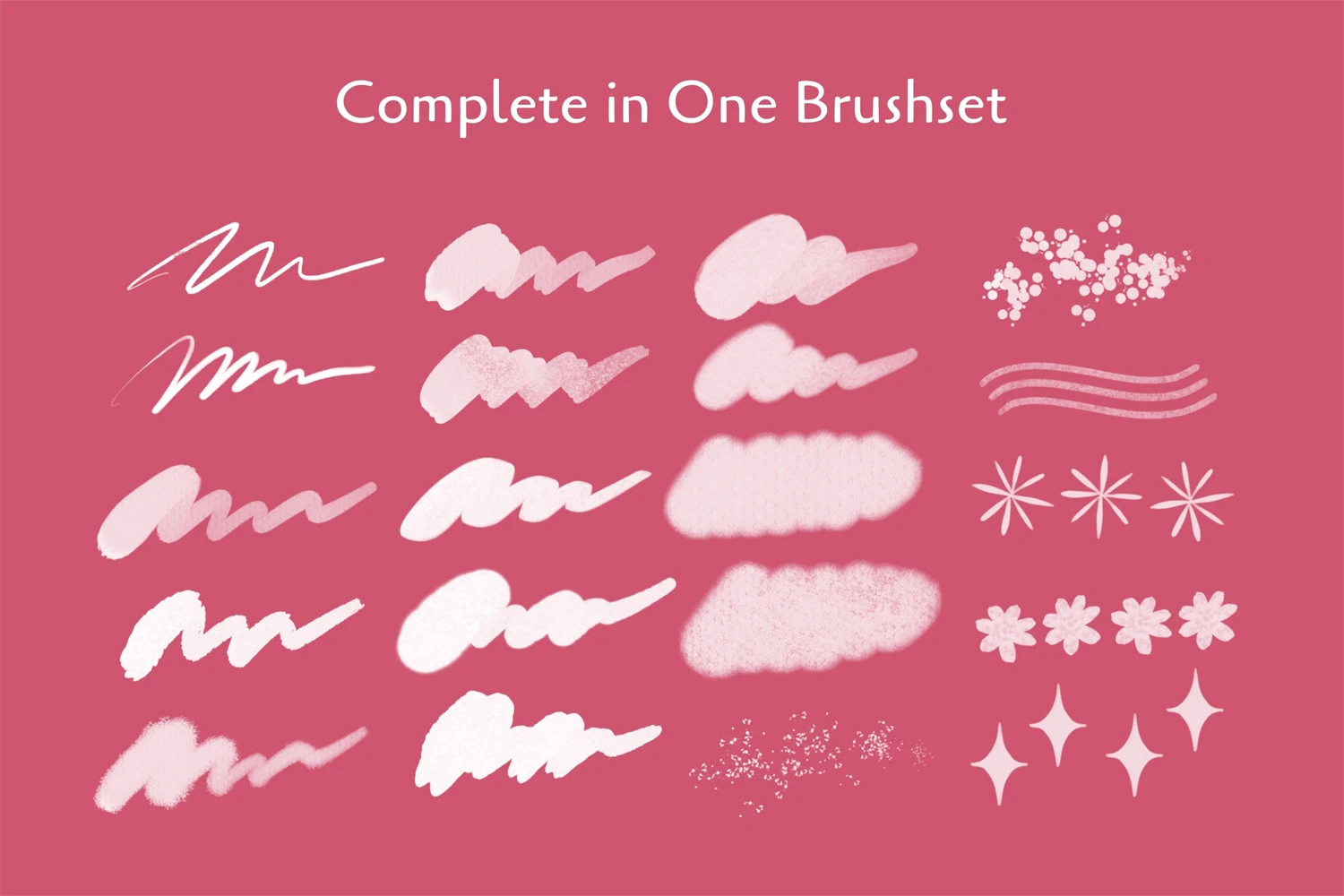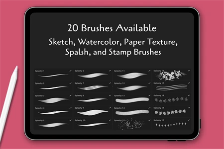 20 Brush Available Sketch, Watercolor, Paper Texture, Splash, and Stamp Brushes