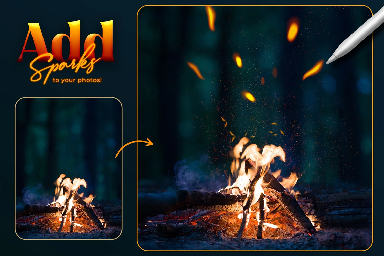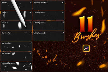 Get 11 brushes for procreate drawing. Realistic fire effect. 11 different spark effects. Easy to add sparks to your photos and artworks. Just brush over and get realistic sparking effect. Brushes with pen pressure sensitivity.