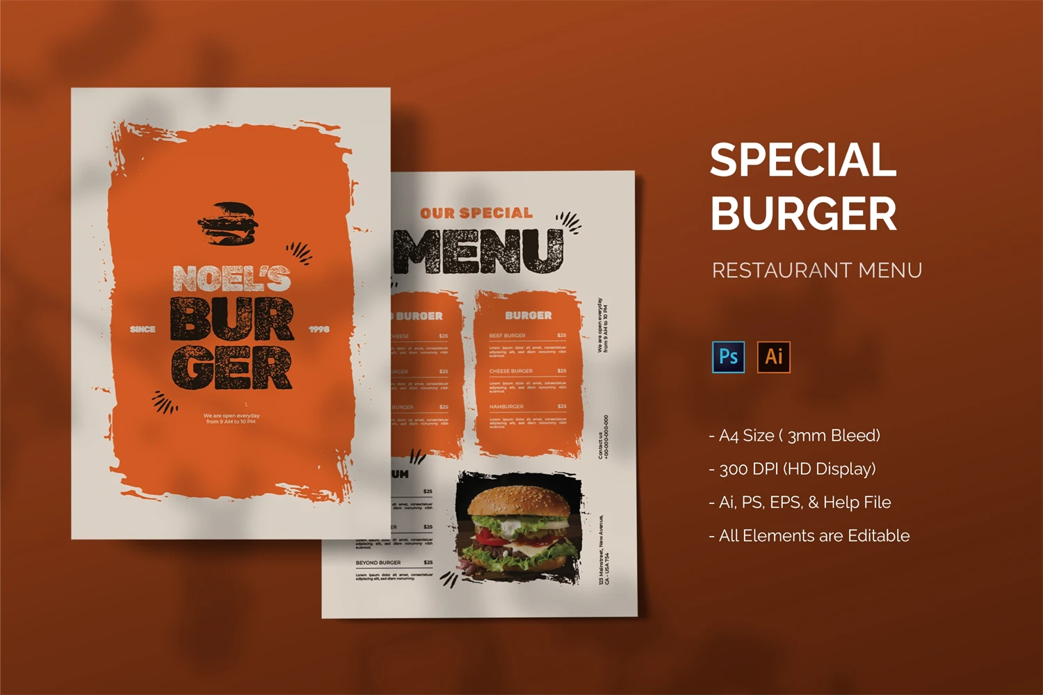 **Special Burger - Food Menu**. This template is excellent for your business and will make your customers interested, elegant, and easily editable according to your needs, this restaurant menu is perfect for, promos, cafes, hotels, and resort shops online. etc. I hope you enjoy this restaurant's menu