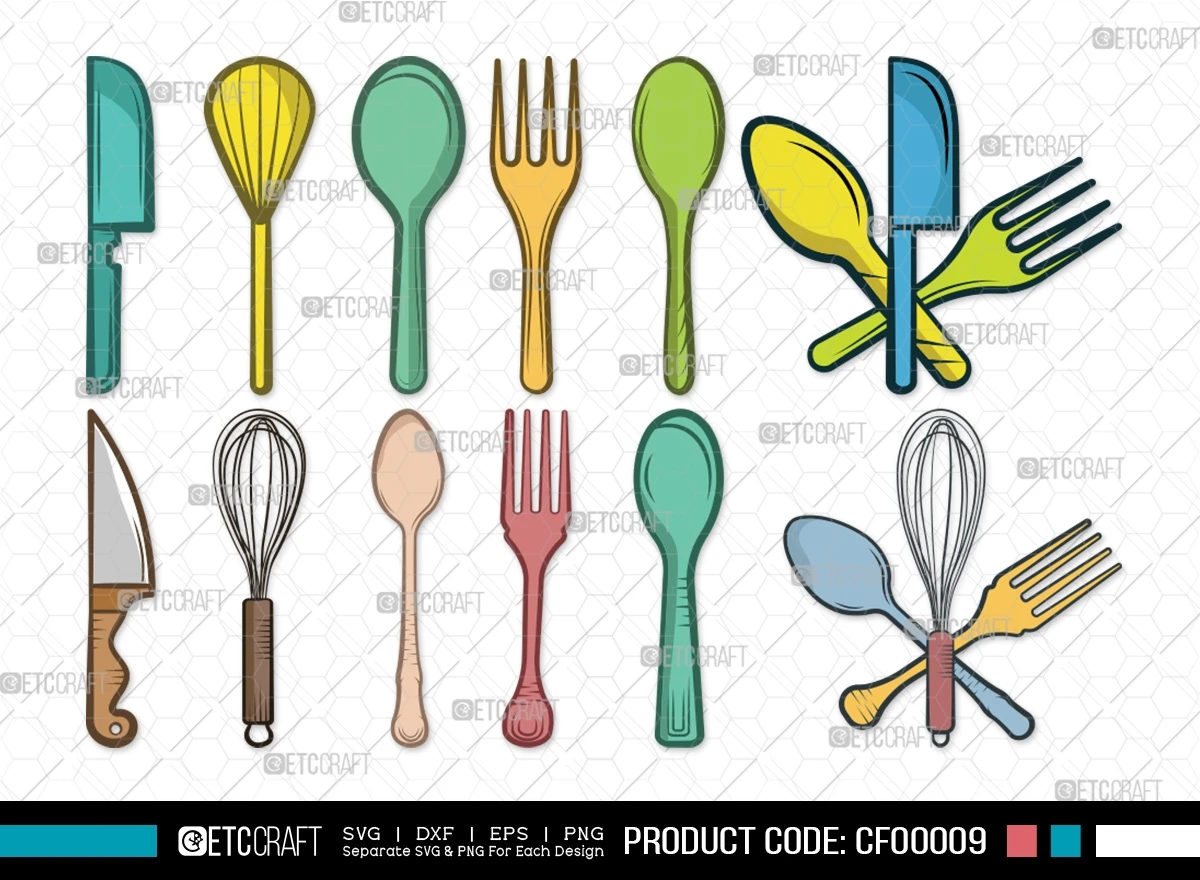Elevate your culinary-inspired crafts with our Spoon Clipart SVG Cut File Fork Knife Utensil Cutlery Bundle. This versatile bundle includes meticulously designed digital clipart featuring various kitchen utensils, perfect for all food enthusiasts and creative crafters.