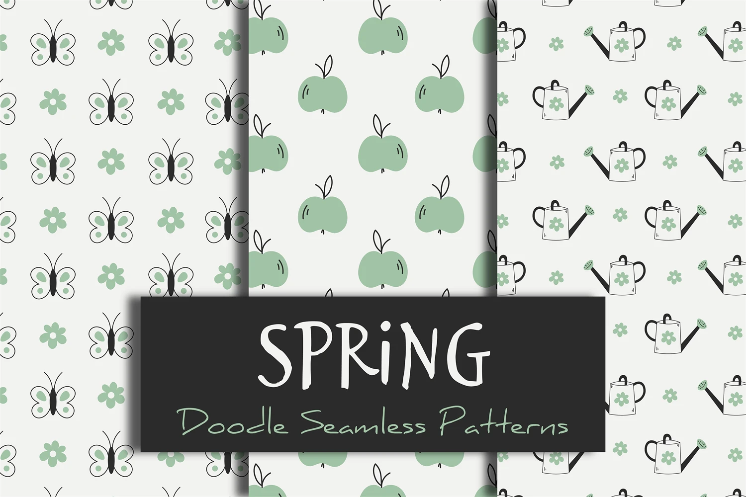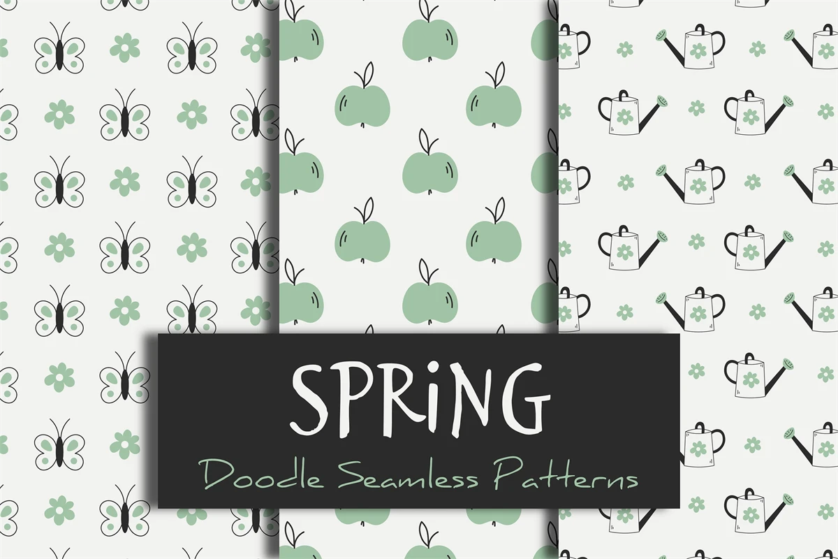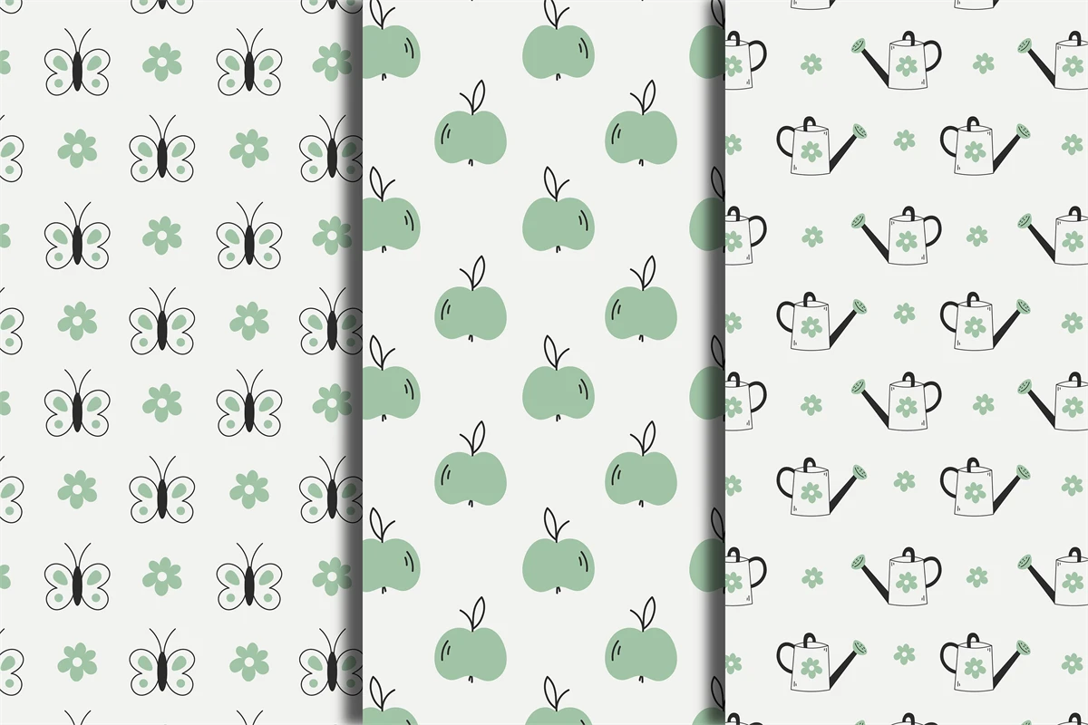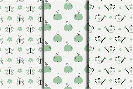 Collection of spring seamless patterns in doodle style. Cute hand drawn green backgrounds with butterfly, apple and watering can for spring and summer design. Springtime and summertime digital papers for scrapbooking, patchwork, fabric, textile, garden, decoration. Repeat vector illustration.
