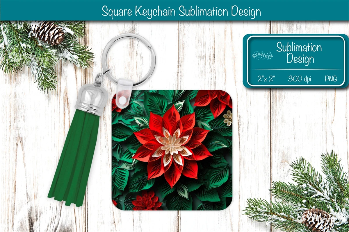 Square keychain sublimation Christmas keychain PNG with Christmas 3D flower quilling. Christmas Sublimation Square keychain with Christmas flower PNG, vibrant colors, and lasting memories. Perfect as a delightful gift.