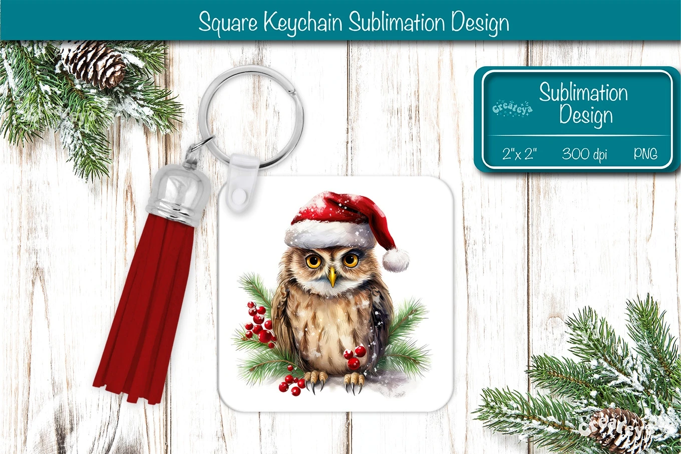 Square keychain sublimation Christmas keychain sublimation design with a cute Watercolor Owl Keychain PNG. Christmas Sublimation Square keychain with adorable snowman, vibrant colors, and lasting memories. Perfect as a delightful gift.