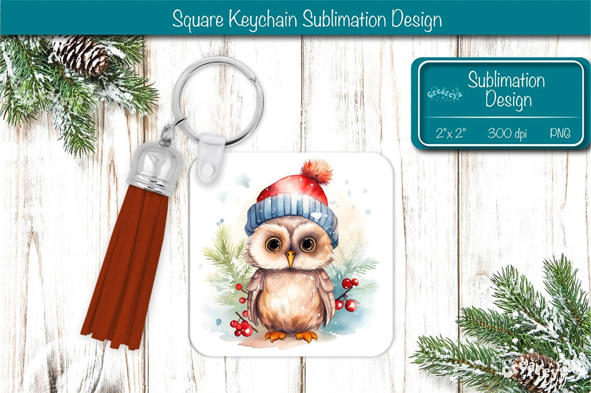 Square keychain sublimation Christmas keychain sublimation design with cute Watercolor Owl Keychain PNG. Christmas Sublimation Square keychain with adorable snowman, vibrant colors, and lasting memories. Perfect as a delightful gift.