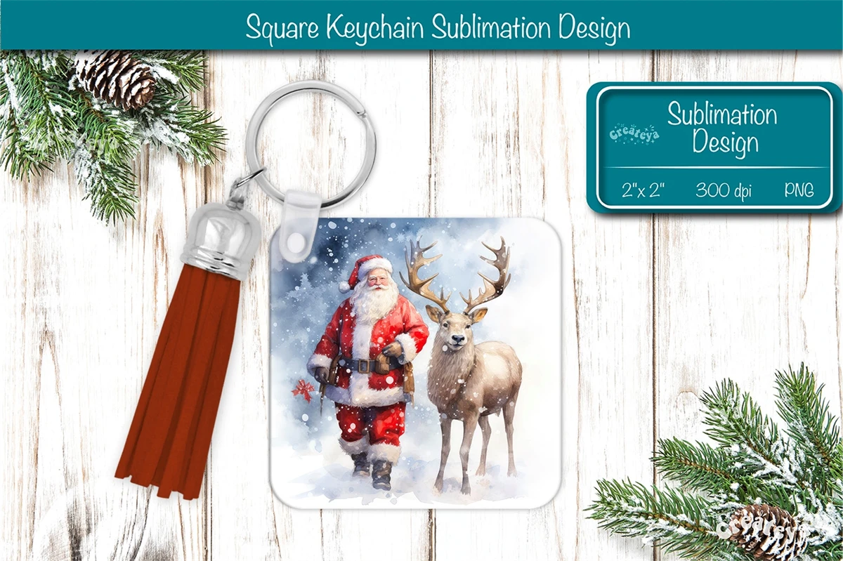 Square keychain sublimation Christmas keychain sublimation design with Watercolor Santa Keychain PNG. Christmas Sublimation Square keychain with adorable snowman, vibrant colors, and lasting memories. Perfect as a delightful gift.