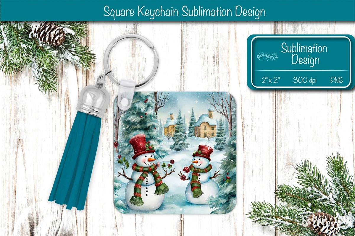 Square keychain sublimation Christmas keychain sublimation design with a cute Watercolor Snowman Keychain PNG. Christmas Sublimation Square keychain with adorable snowman, vibrant colors, and lasting memories. Perfect as a delightful gift.