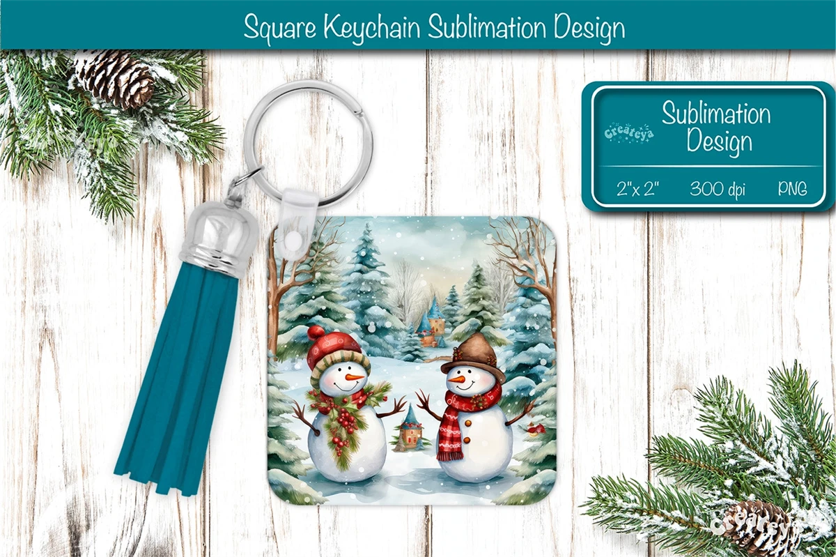 Square keychain sublimation Christmas keychain sublimation design with a cute Watercolor Snowman Keychain PNG. Christmas Sublimation Square keychain with adorable snowman, vibrant colors, and lasting memories. Perfect as a delightful gift.