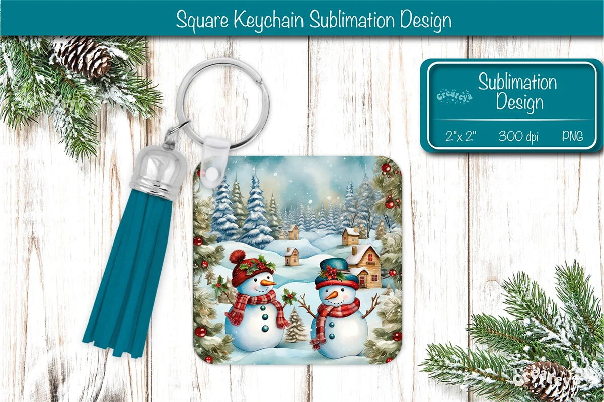 Square keychain sublimation Christmas keychain sublimation design with a cute Watercolor Snowman Keychain PNG. Christmas Sublimation Square keychain with adorable snowman, vibrant colors, and lasting memories. Perfect as a delightful gift.