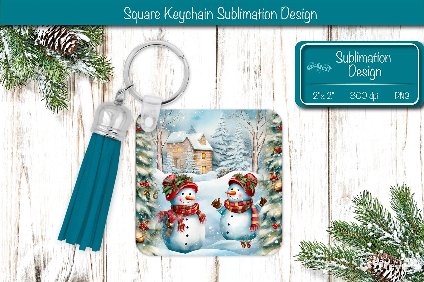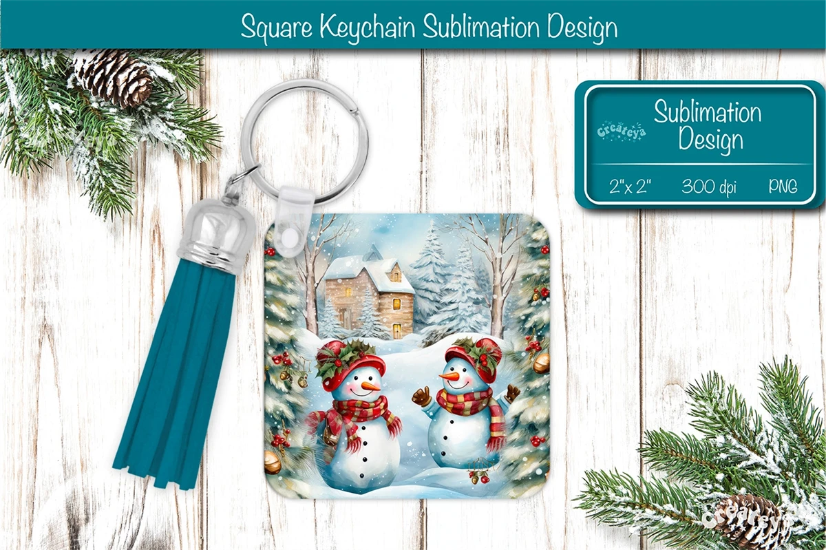Square keychain sublimation Christmas keychain sublimation design with a cute Watercolor Snowman Keychain PNG. Christmas Sublimation Square keychain with adorable snowman, vibrant colors, and lasting memories. Perfect as a delightful gift.