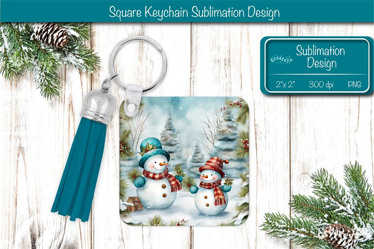 Square keychain sublimation Christmas keychain sublimation design with a cute Watercolor Snowman Keychain PNG. Christmas Sublimation Square keychain with adorable snowman, vibrant colors, and lasting memories. Perfect as a delightful gift.