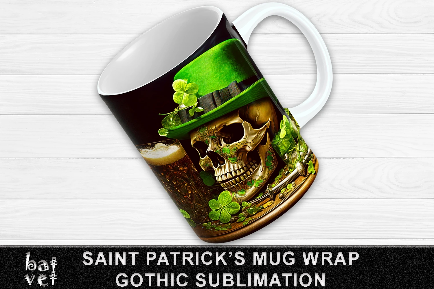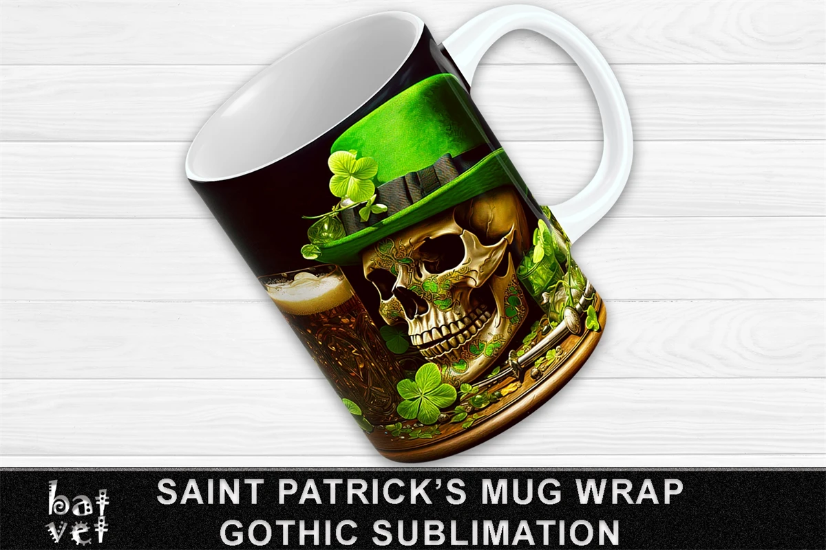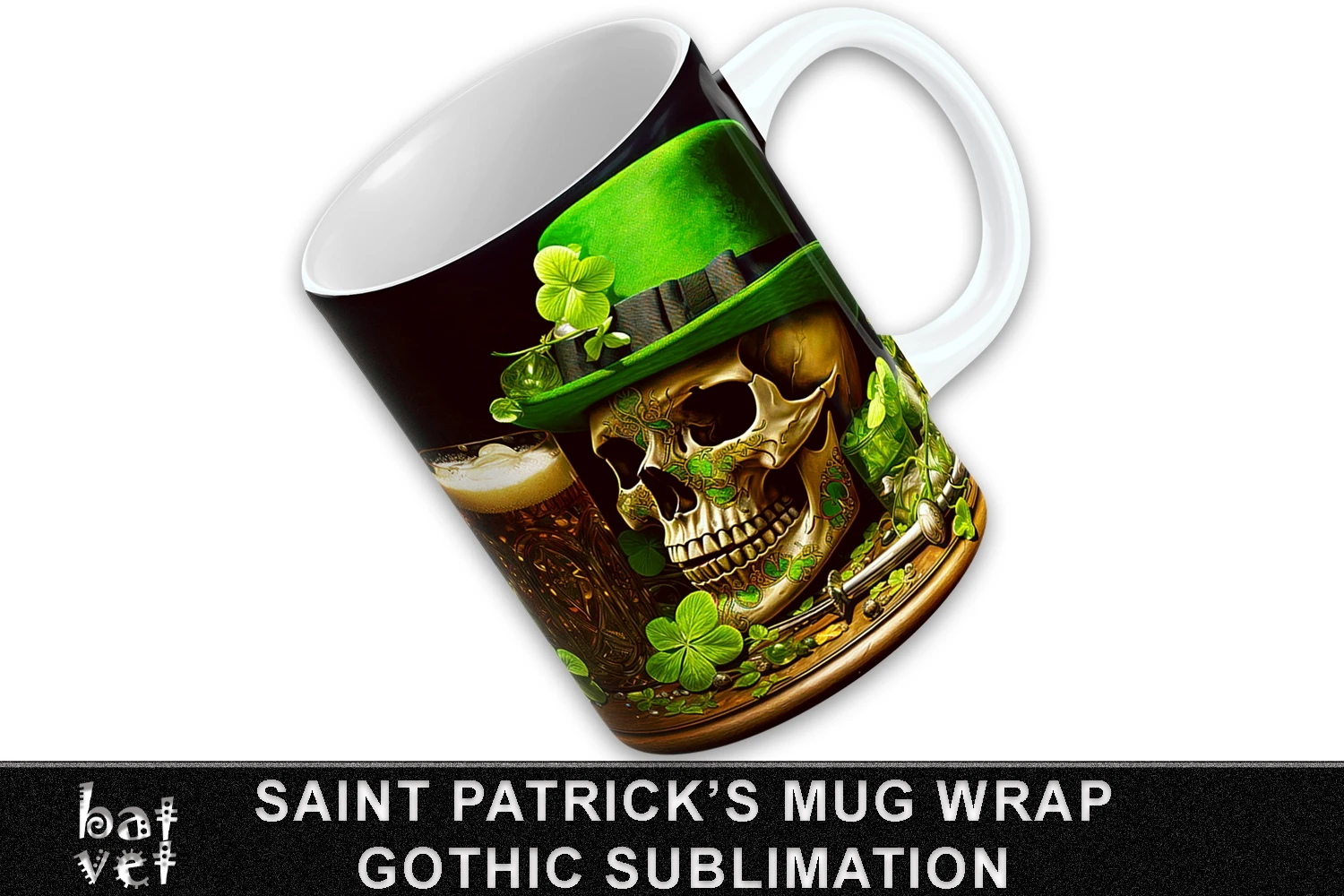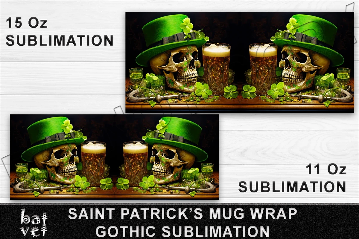 St Patrick's Day 11 Oz Mug Wrap and 15 Oz Mug Design, Gothic Skull, Beer, Shamrock, Hat, Green Sublimation for Mug Print.