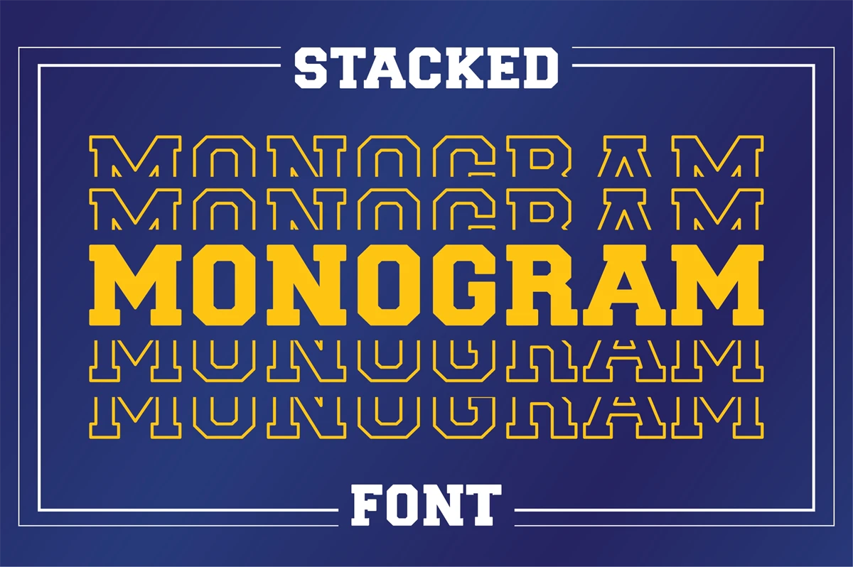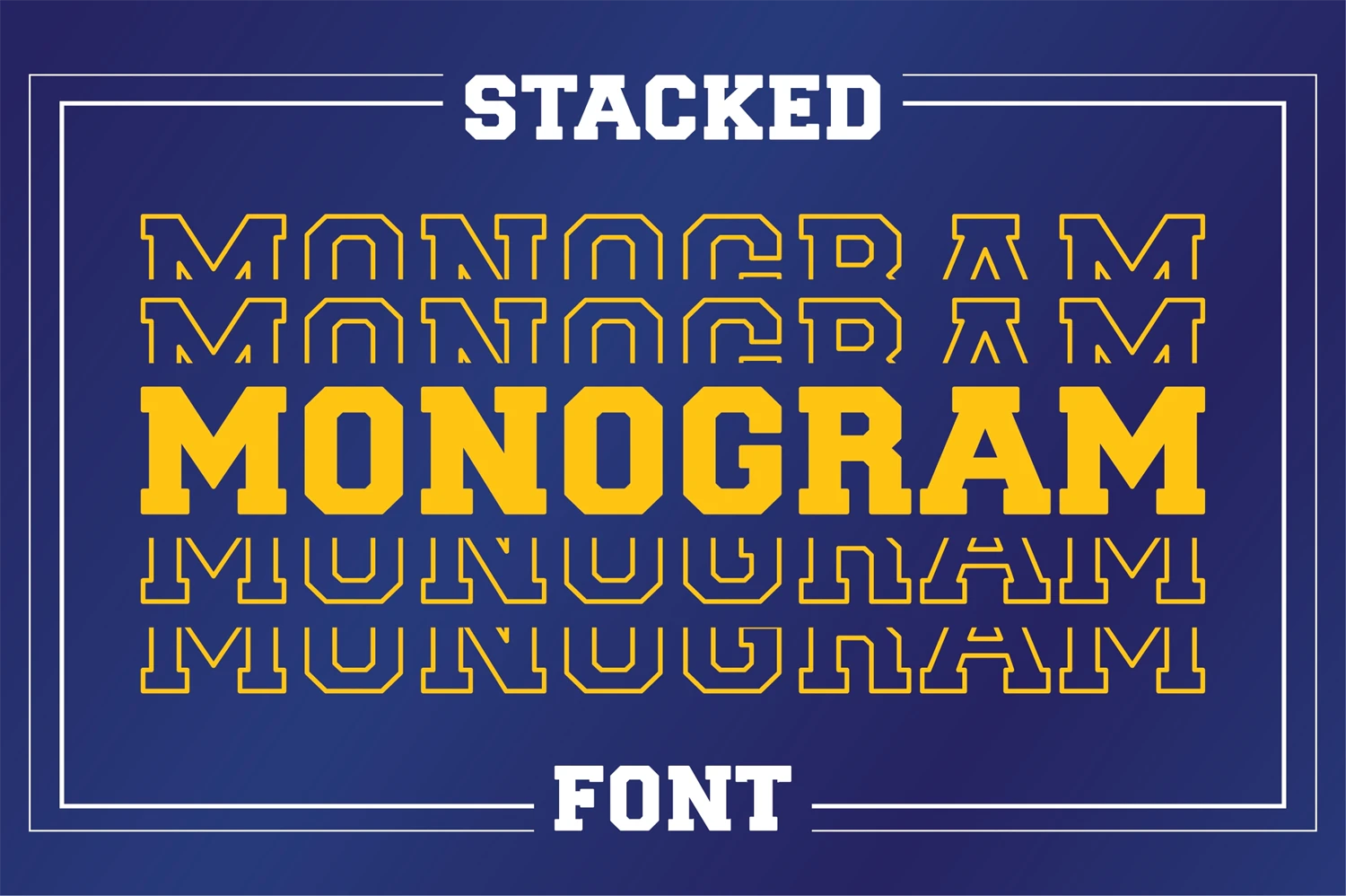 Stacked Pro is a sport-stacked style. Easy to create design sport shirt name team, logo, head title. This font is encoded which means you can access all of the amazing glyphs and ligatures with ease!