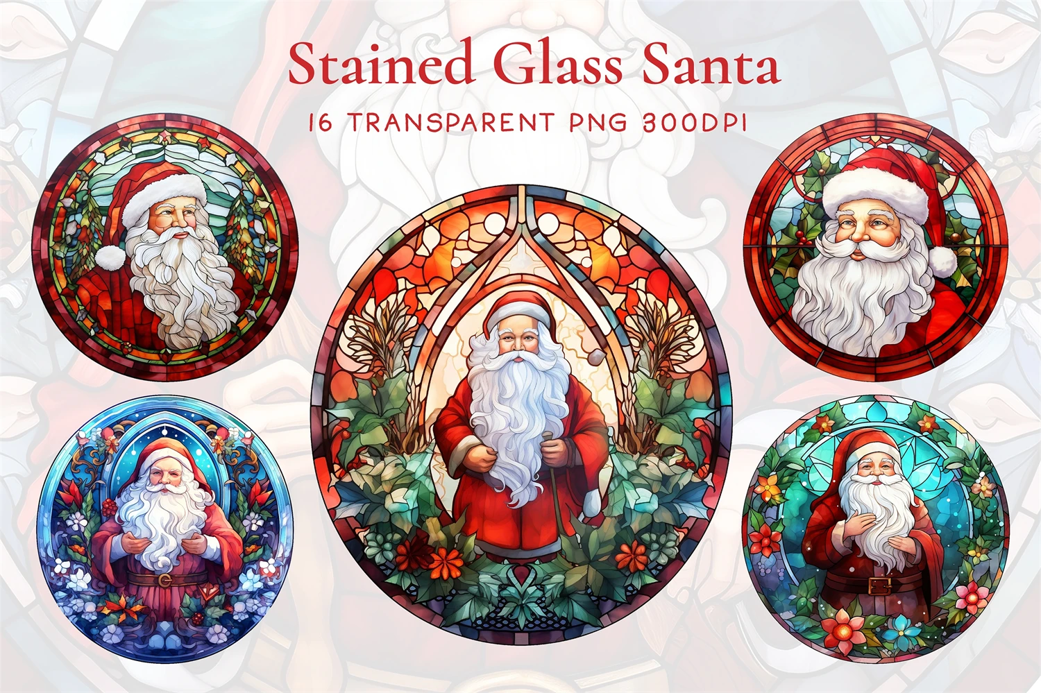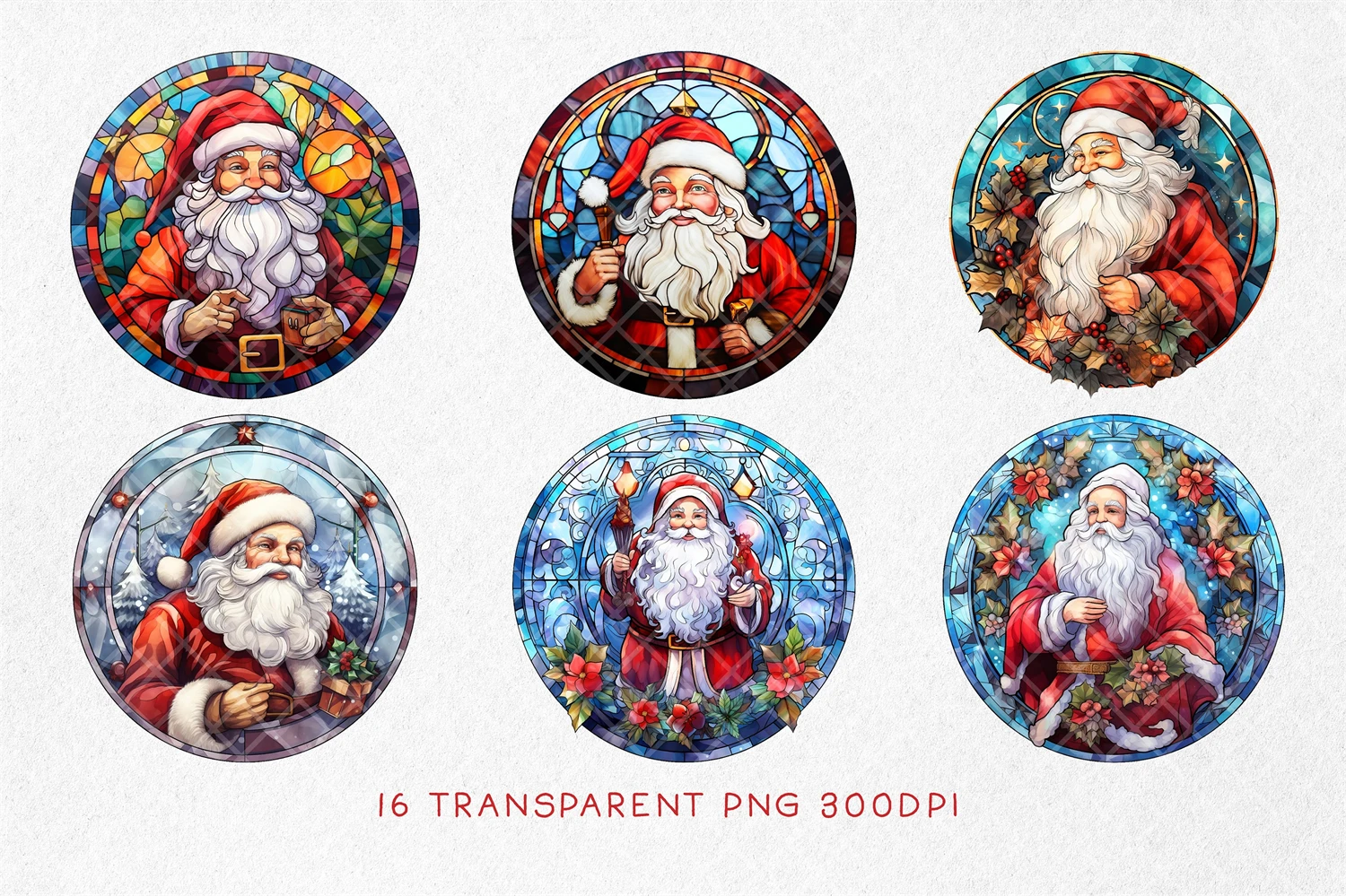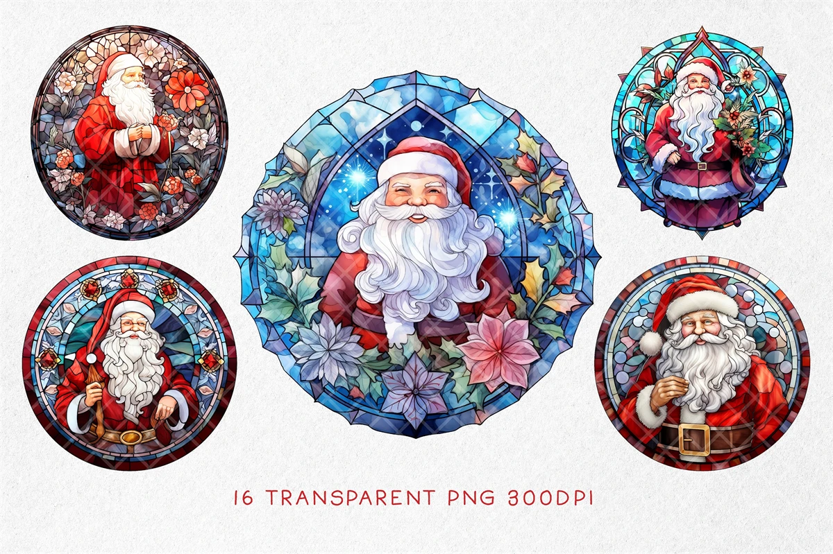 Stained Glass Santa Claus BUNDLE, Mosaic Window Festive Clipart, Christmas Celebration Art, Stained Glass Santa, Sublimation Ready Design. All elements are high-resolution (300dpi) PNG files with transparent backgrounds.