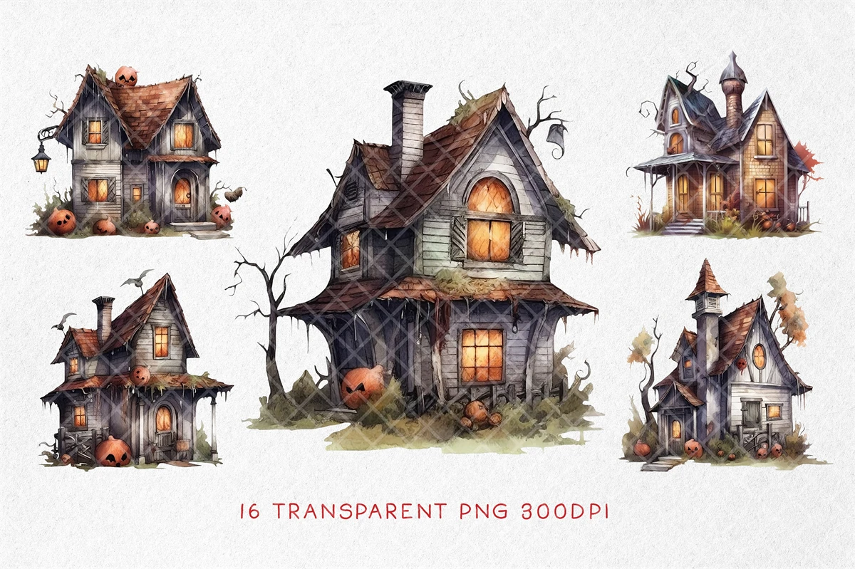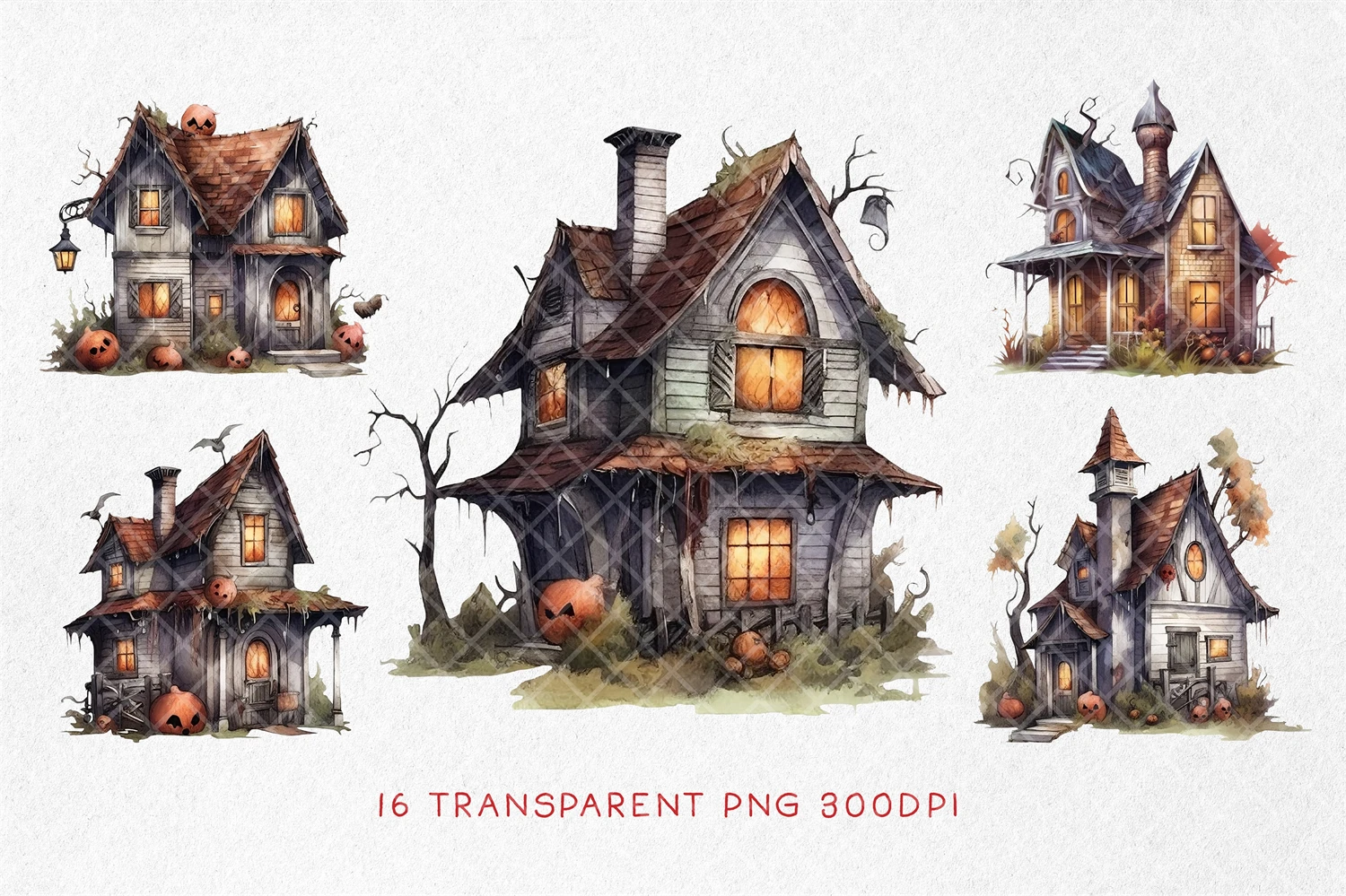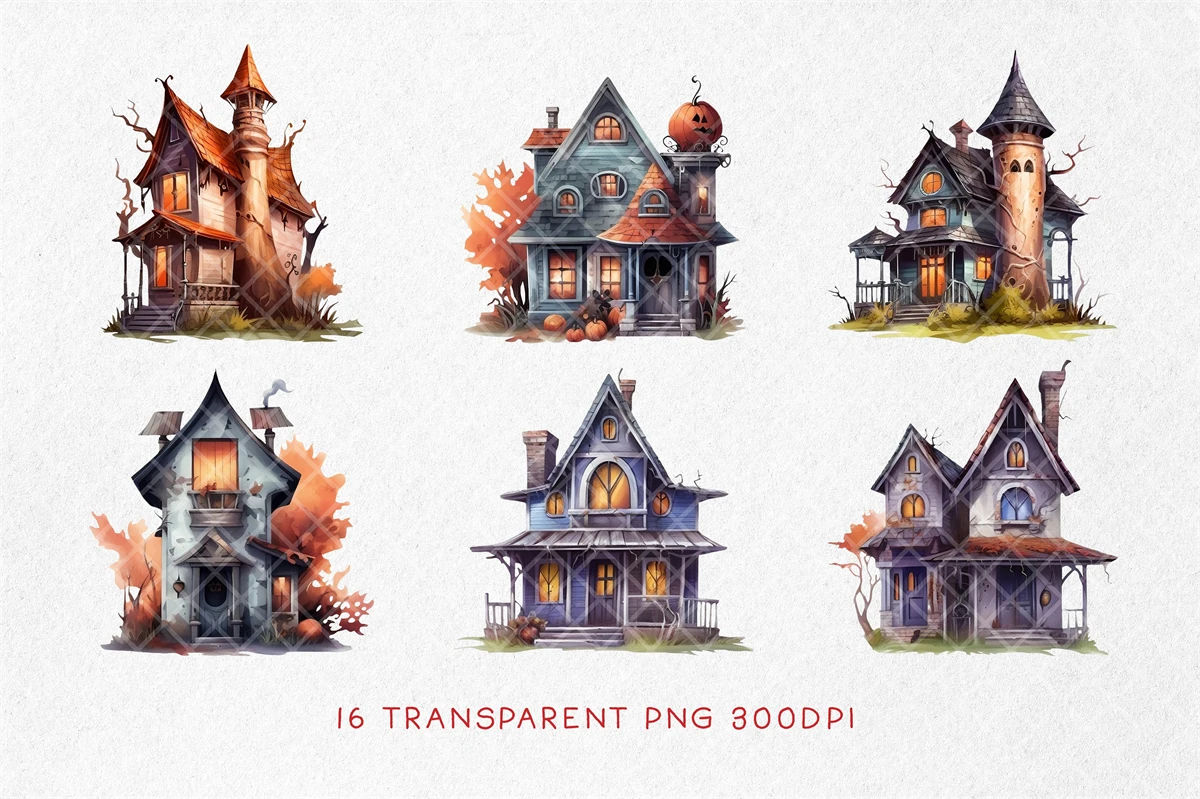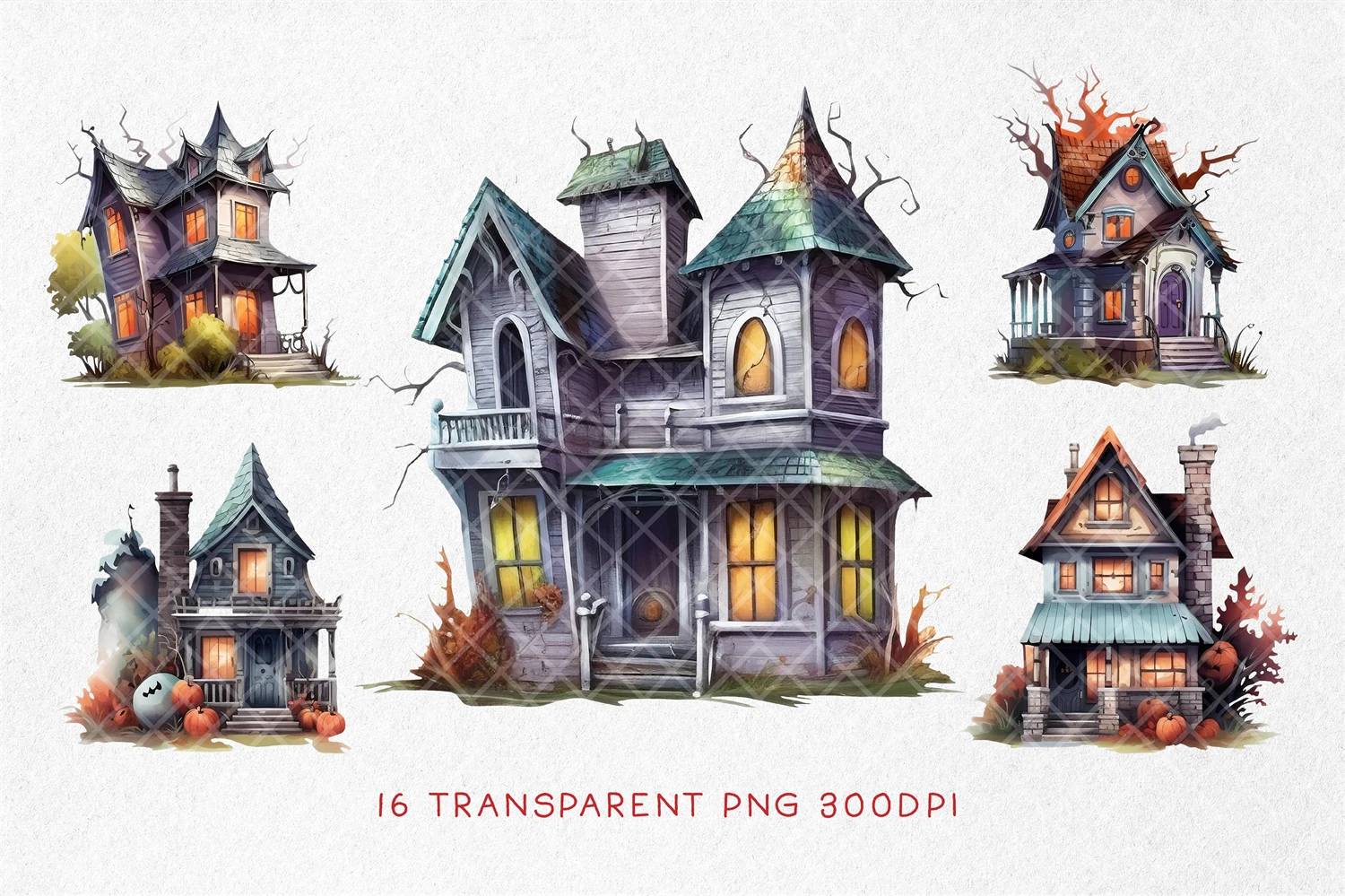 Spooky Watercolor Haunted House Clipart Bundle, Halloween Witch Stickers, Halloween Clipart, Spooky House Images, Old Witch House Clipart. All elements are high-resolution (300dpi) PNG files with transparent backgrounds.