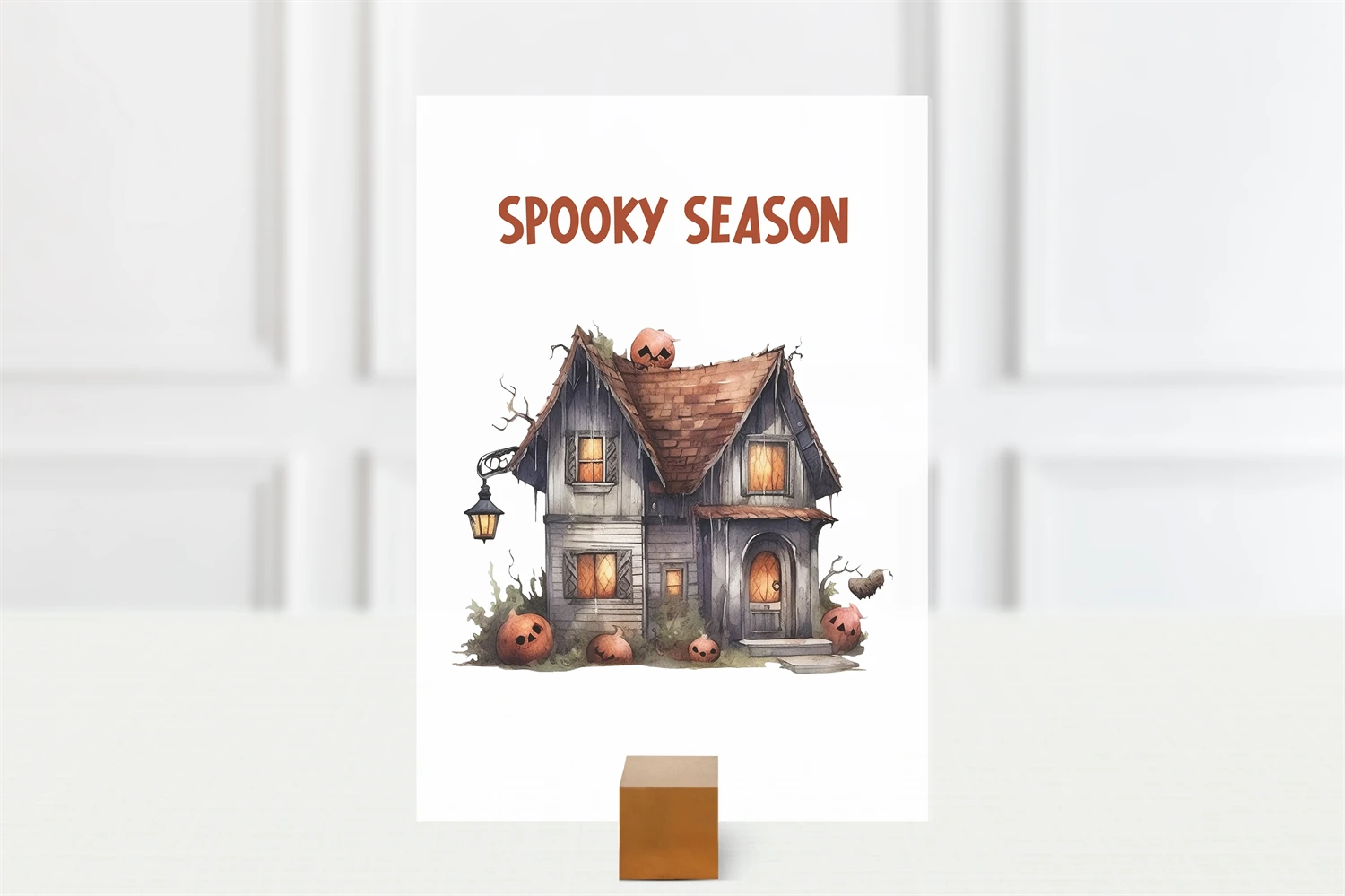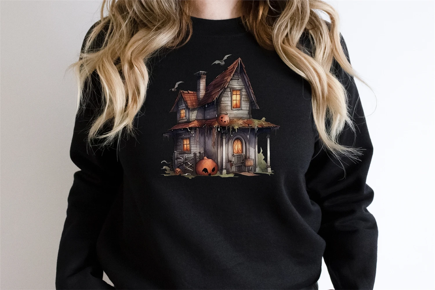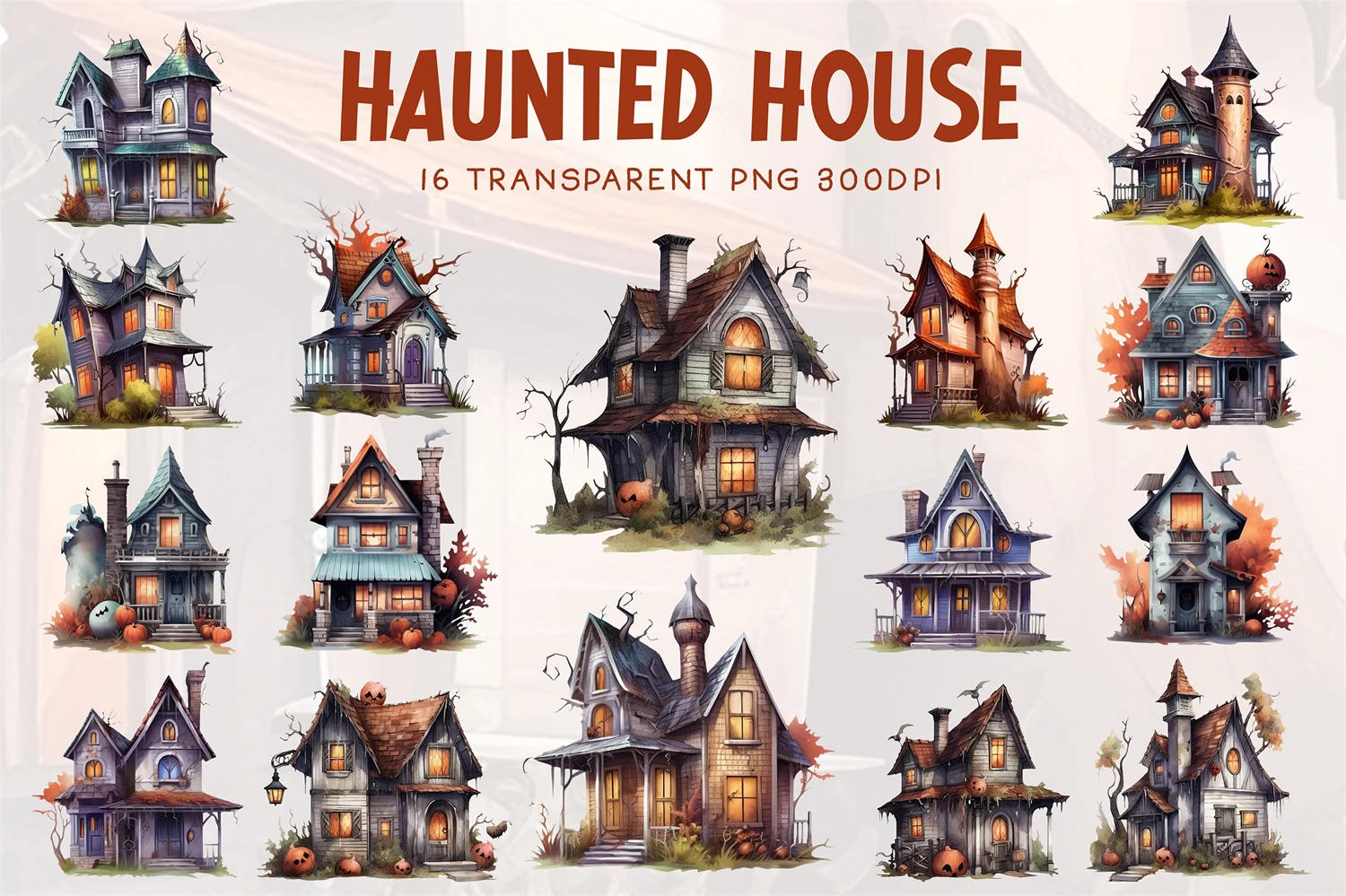 Spooky Watercolor Haunted House Clipart Bundle, Halloween Witch Stickers, Halloween Clipart, Spooky House Images, Old Witch House Clipart. All elements are high-resolution (300dpi) PNG files with transparent backgrounds.
