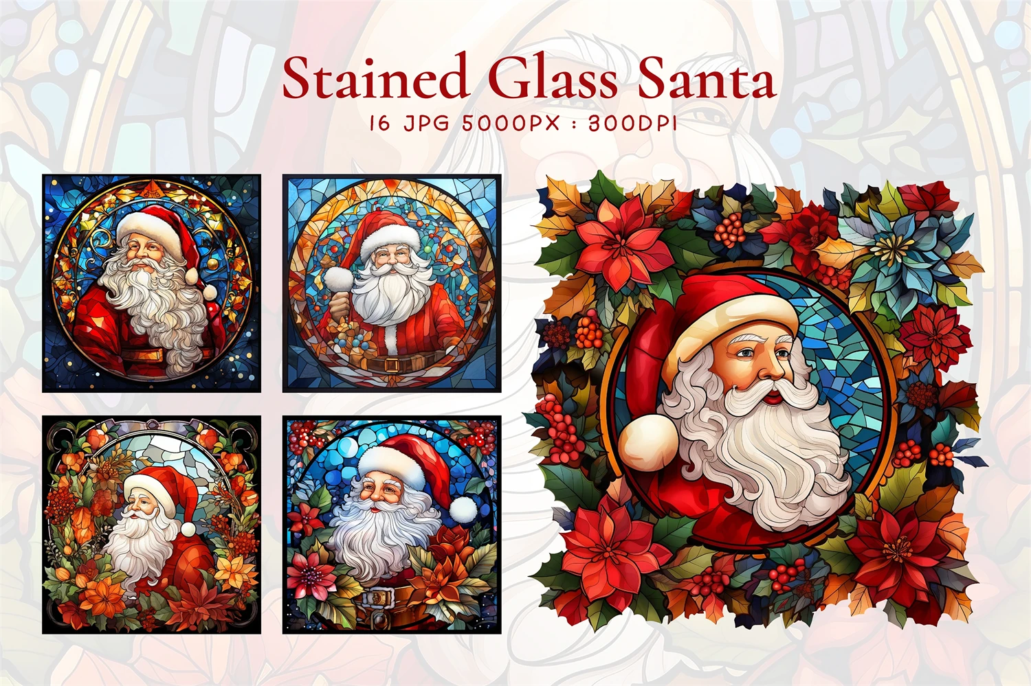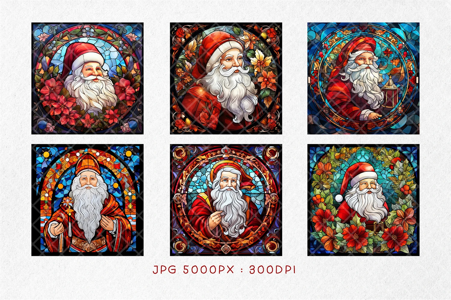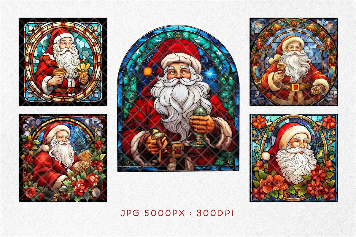 Stained Glass Santa Claus BUNDLE, Mosaic Window Festive Clipart, Christmas Celebration Art, Stained Glass Santa, Sublimation Ready Design. All elements are high-resolution (300dpi) PNG files with transparent backgrounds.