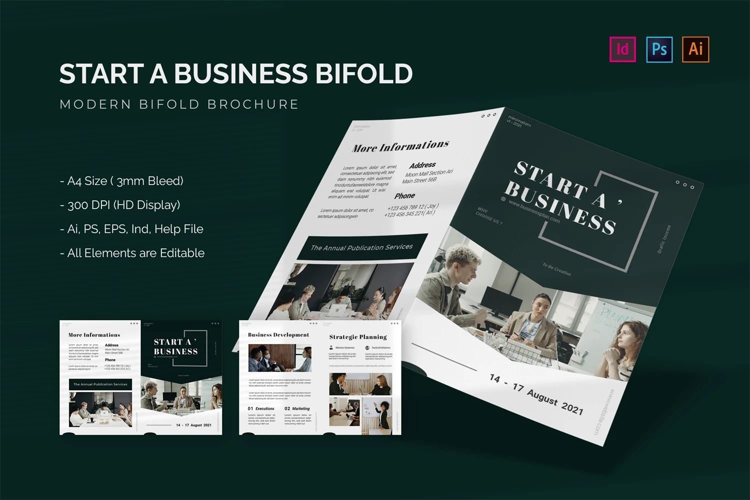 Start A Business - Bifold Brochure We present this Bifold Brochure for you, simple and very elegant, and this Bifold Brochure is suitable for all types of your business, made with Adobe InDesign (INDD), Adobe Photoshop (PSD) and Adobe Illustrator (AI), very easy to customize, Hope you Like it, dont forget to rate, Thanks.