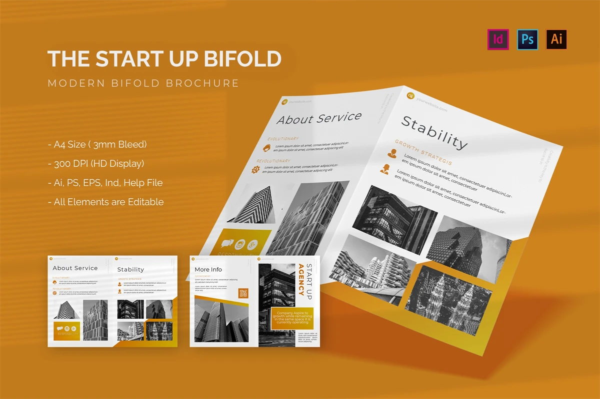 Start Up Agency - Bifold Brochure We present this Bifold Brochure for you, simple and very elegant, and this Bifold Brochure is suitable for all types of your business, made with Adobe InDesign (INDD), Adobe Photoshop (PSD) and Adobe Illustrator (AI), very easy to customize, Hope you Like it, dont forget to rate, Thanks.