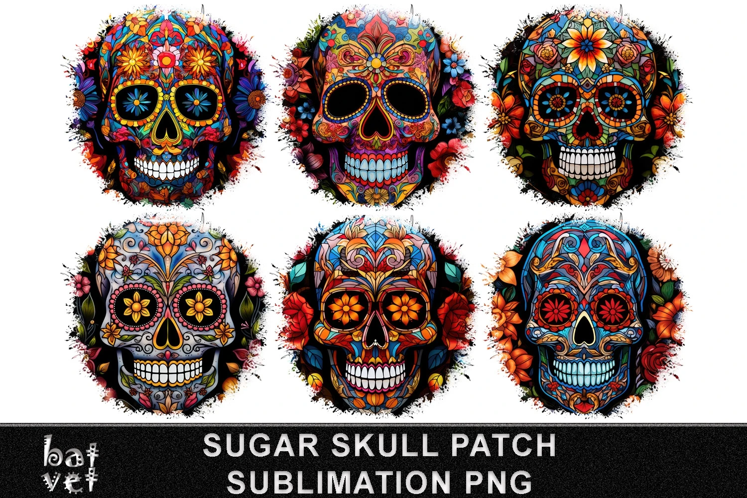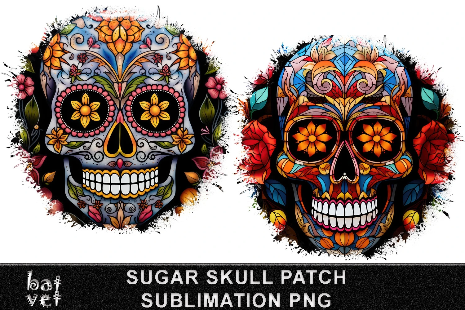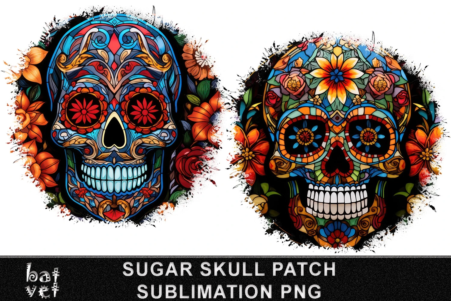 Distressed Background Stained Glass Sugar Skull Background Sublimation T-Shirt Patch Set. Patches for T-Shirts, Jackets, Pillows, Tote bags. Designed for Sublimation Printing.