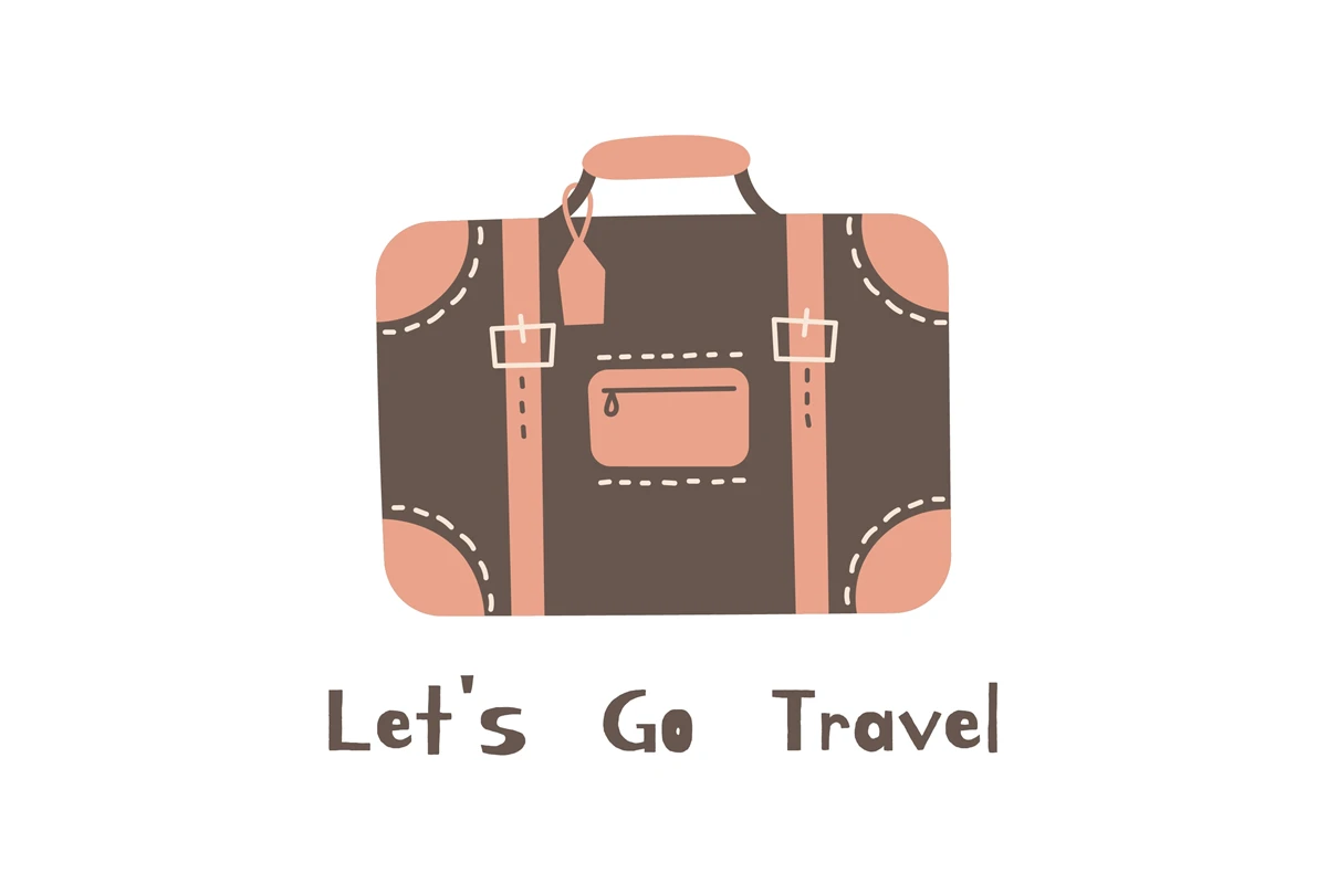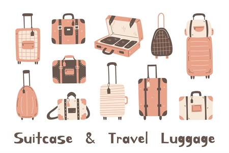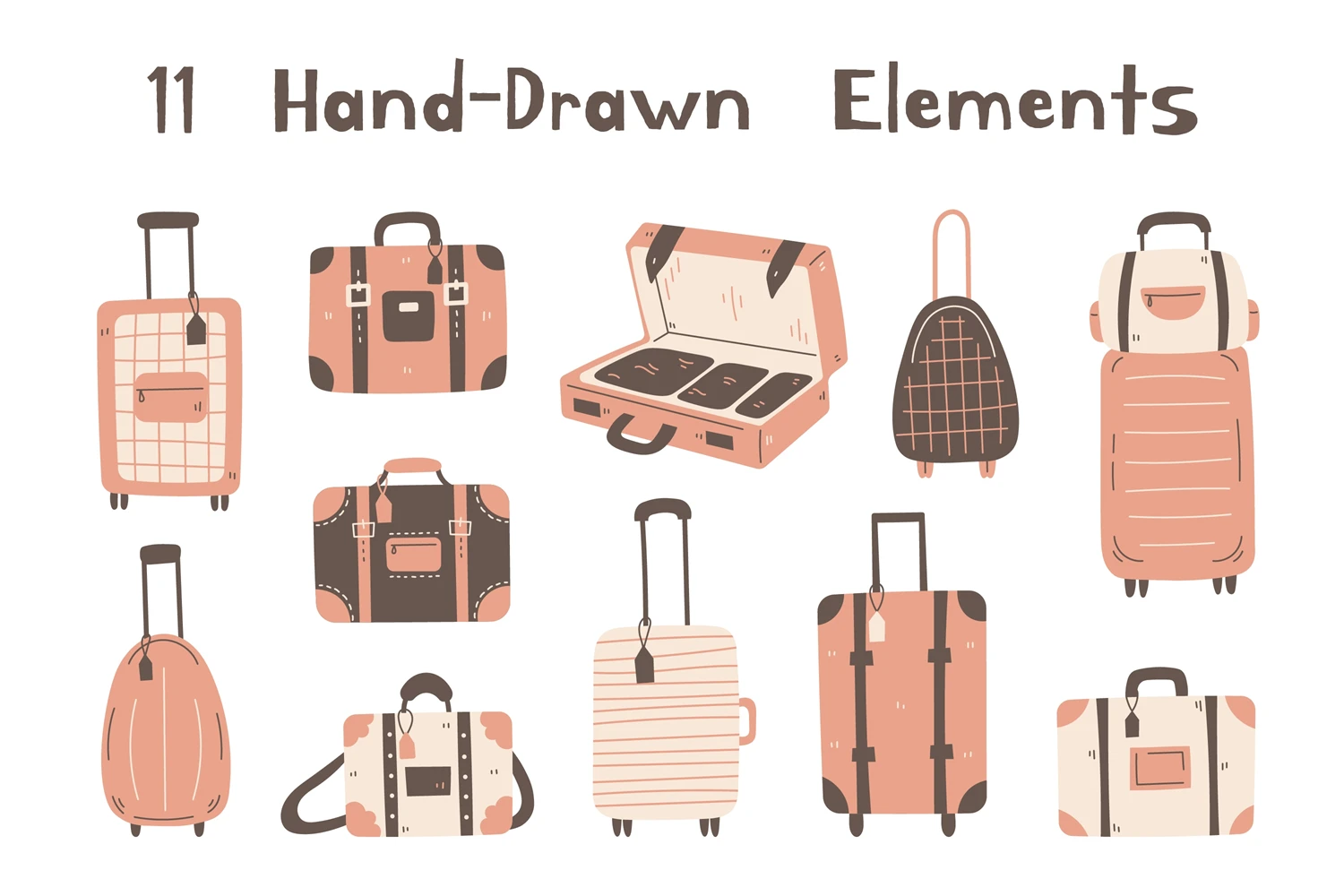 Hand drawn trolley, baggage, cabin luggage and suitcase bundle for traveling. Large brown bags with handle and wheels. Journey, business trip, vacation, voyage design elements. Vector illustration. Flat design in minimal style with doodle elements. Perfect for card making, poster, postcard, sublimation, book cover, website, product design, etc.