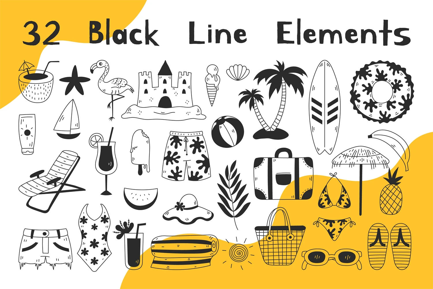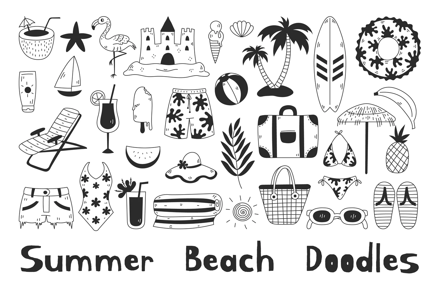 Summer and Beach Doodle elements collection. Hand-drawn summertime line icons vector set. Sketch vacation and holidays symbols. Outline symbols, accessories, clothes, swimsuit, hat, palm tree, flamingo, watermelon, banana, cocktail, juice, sand castle, surfboard, umbrella, deck chair, pineapple, flip flop, bag, towel, mat, sunglasses, ice cream, shorts, inflatable ring, inflatable ball, sunscreen cream. Vector illustration in comic cartoon style.