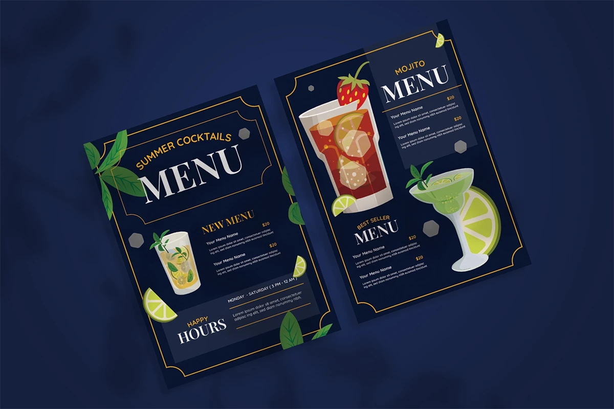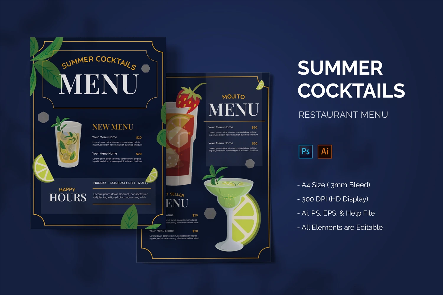 **Summer Cocktails - Food Menu**. This template is excellent for your business and will make your customers interested, elegant, and easily editable according to your needs, this restaurant menu is perfect for, promos, cafes, hotels, and resort shops online. etc. I hope you enjoy this restaurant's menu