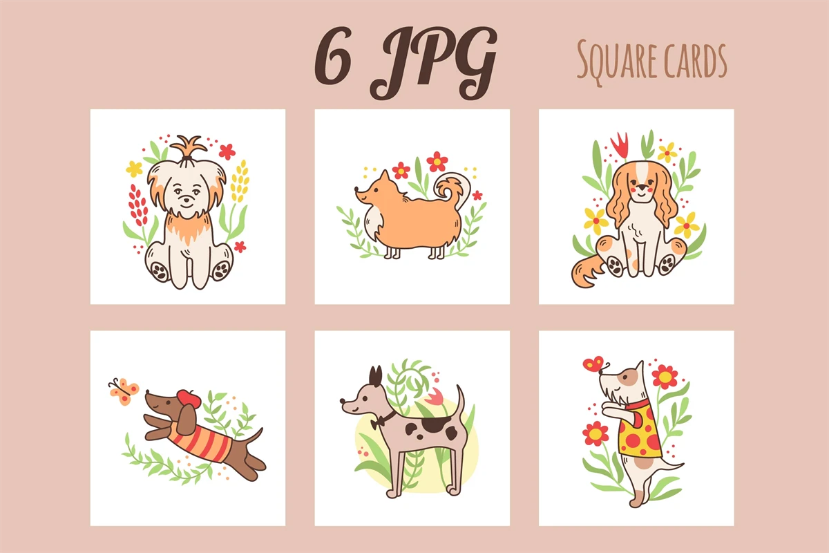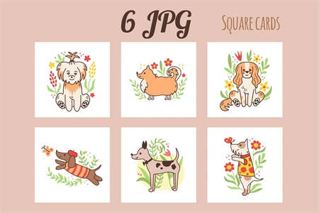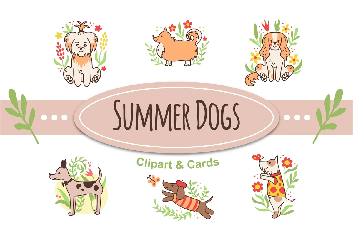 Cute collection with funny various breeds puppies and nature elements: green twigs, flowers, branches, leaves, butterflies. Pets summer activity. Summertime fun for baby, kids, t-shirts, greeting cards, posters, banners, pets accessory, mugs, frame arts, nursery, seasonal home decor.