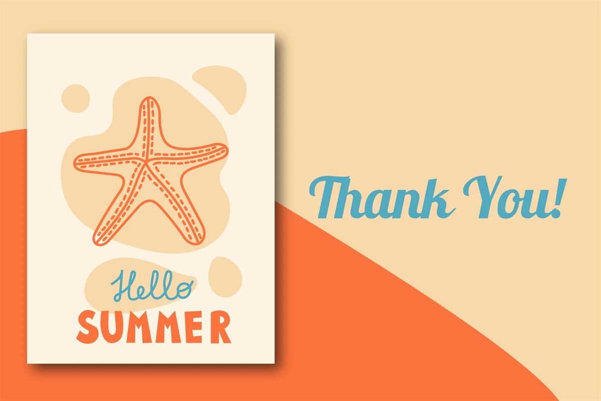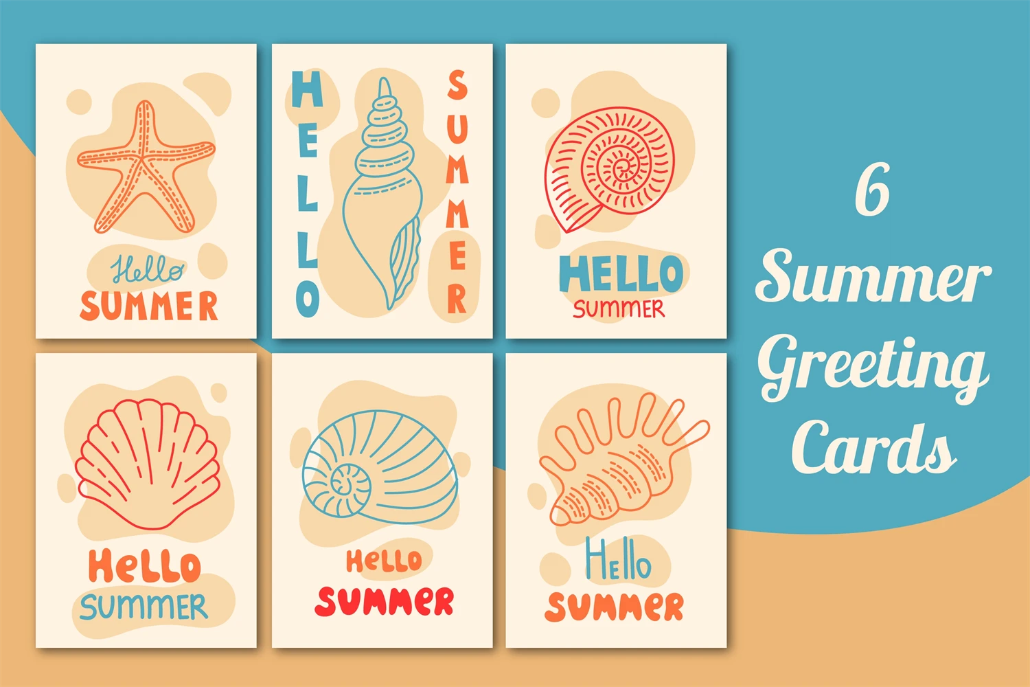 Cute pastel colored seasonal greeting cards, posters, banners with hand drawn seashells, starfish and handwritten lettering. Doodle style summer symbols on abstract blots are perfect for party and invitations.