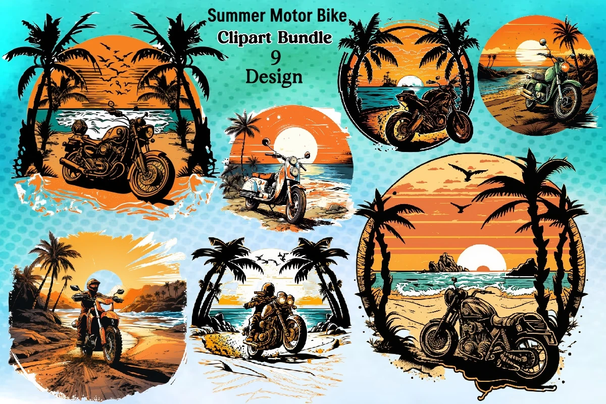Watercolor Summer Motorcycle Clipart PNG Bundle