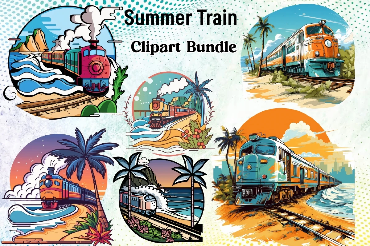 Watercolor Summer Train Clipart PNG Bundle