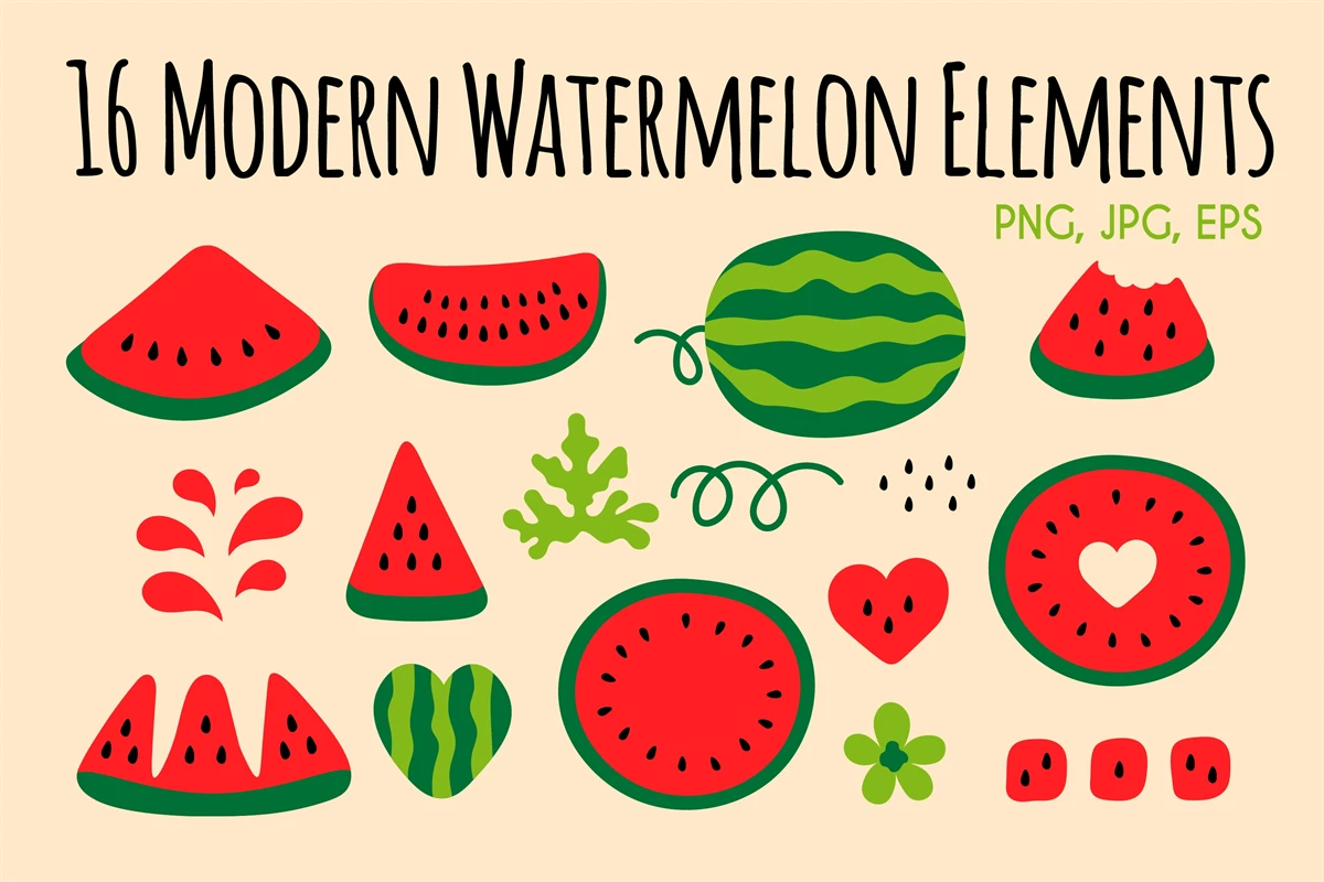 Modern Watermelon clipart with 16 creative elements: slice, piece, leaf, flower, seeds, peel, heart, juice. Trendy summer fruit bundle in minimal flat style for seasonal decoration, kids, posters, cards, social media, scrapbooking, food and drink packaging, gardening, farming, etc.