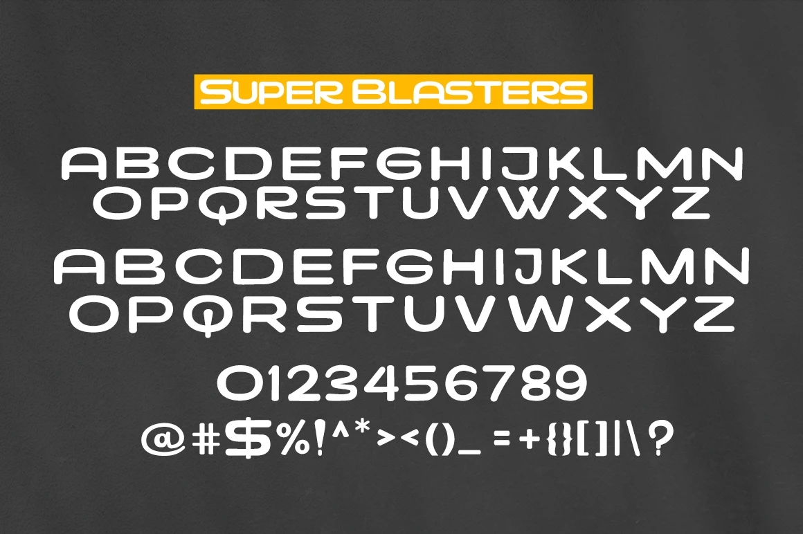 Super Blasters is built with OpenType features and includes initial and ending language styles, alternative characters for most lowercase letters, numbers, punctuation, alternatives, endings, and also supports other languages.