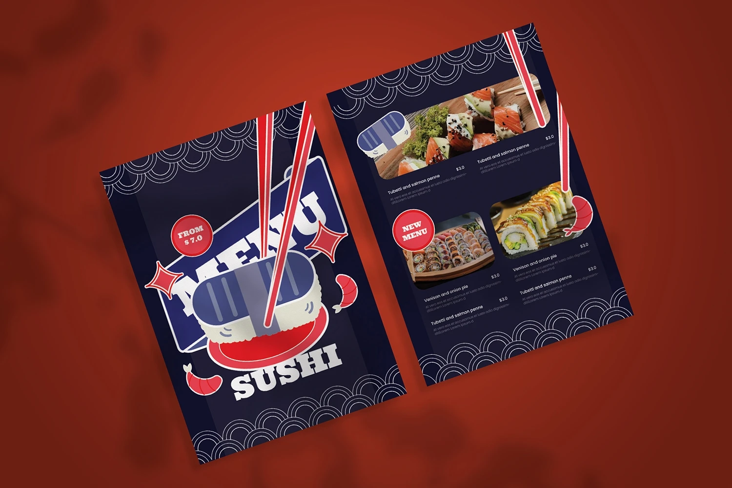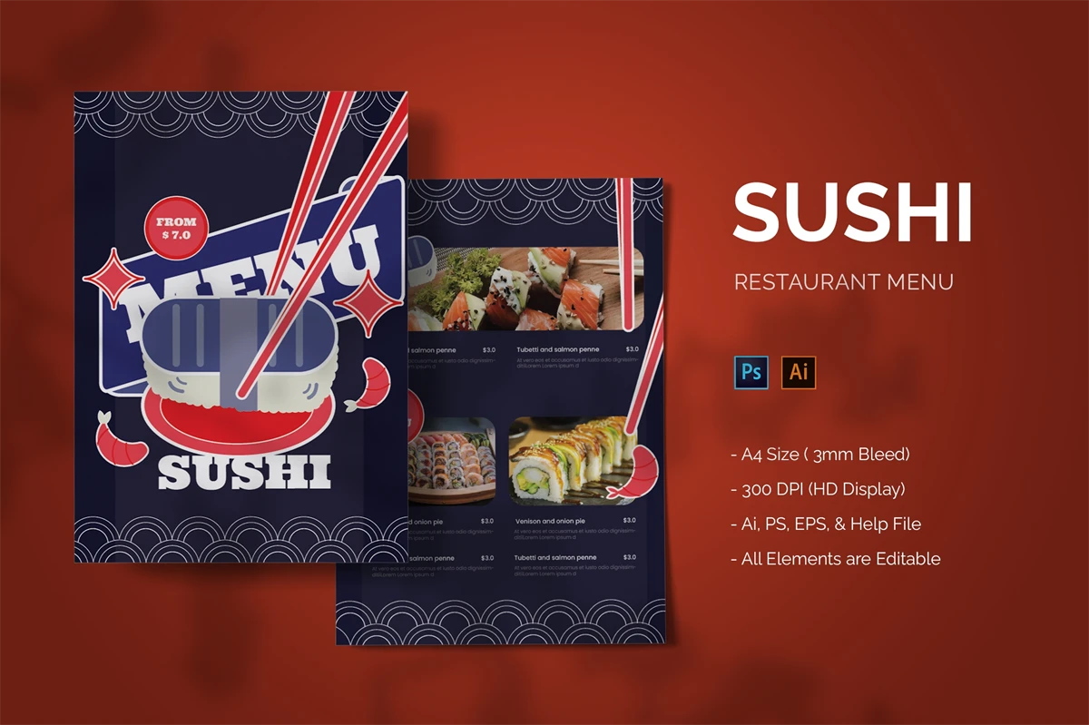 **Sushi Japan - Food Menu**. This template is excellent for your business and will make your customers interested, elegant, and easily editable according to your needs, this restaurant menu is perfect for, promos, cafes, hotels, and resort shops online. etc. I hope you enjoy this restaurant's menu