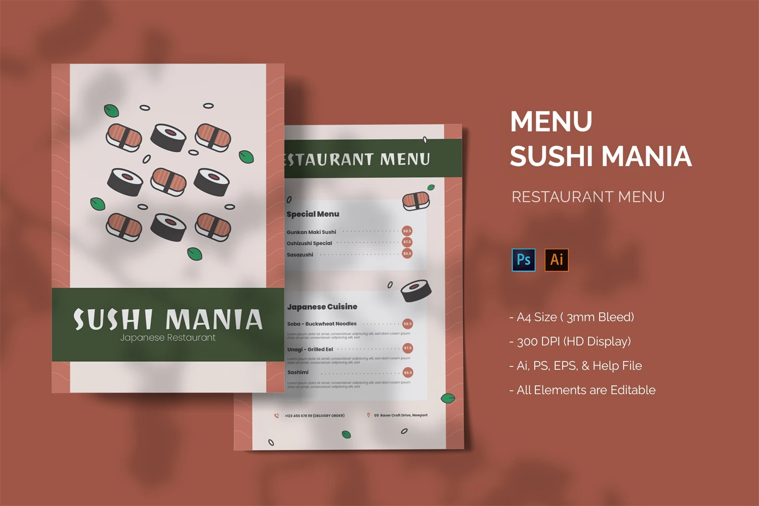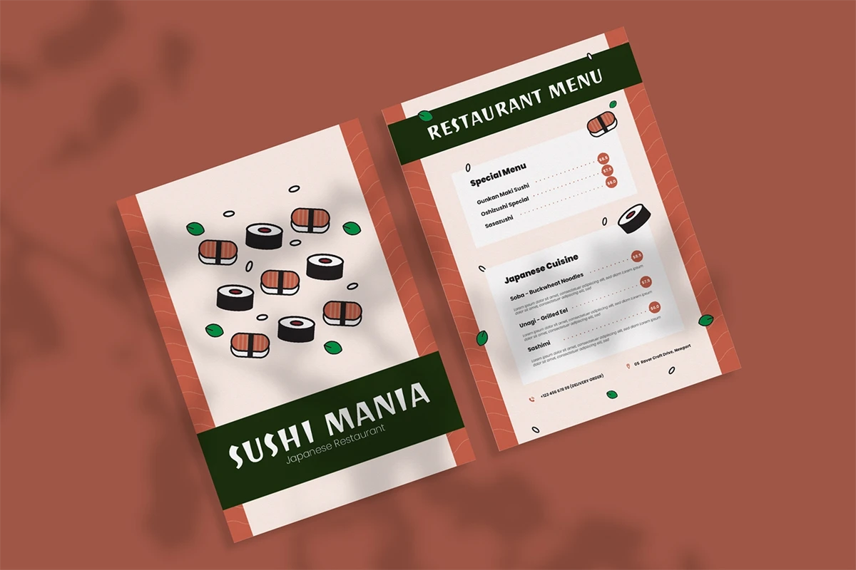 Sushi Mania - Restaurant Menu. This template is great for your business and will make your customers interested, elegant, and easily editable according to your needs, this restaurant menu is perfect for, promos, cafes, hotels, resort shops online. etc. I hope you enjoy this restaurant menu
