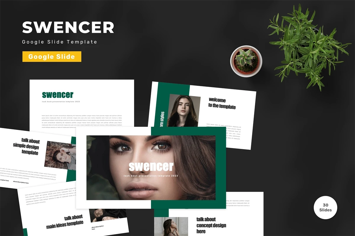Get it now! **Swencer - Google Slide Template** for All Business and Personal Needs All elements on this template are editable; input your content, replace your image with a placeholder, change the color, and all presentations include an animated slide to present your slides.