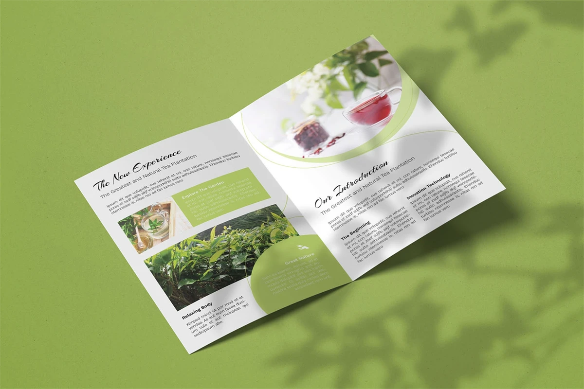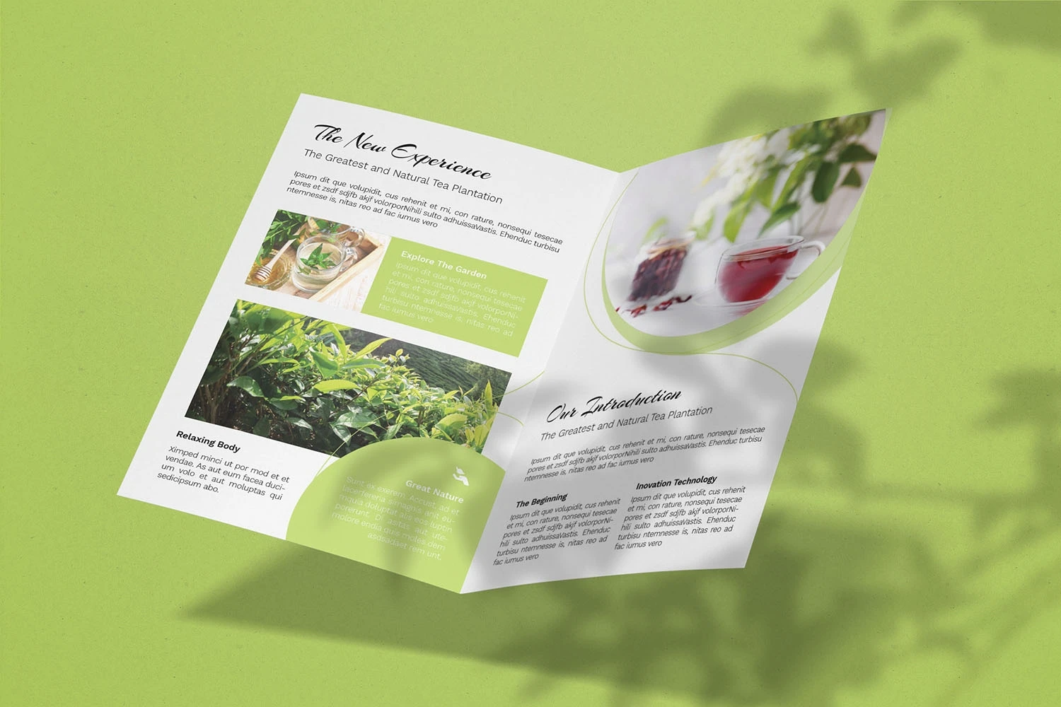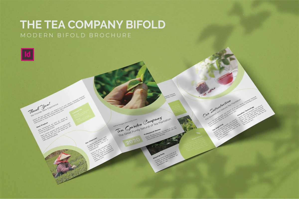 Tea Company - Bifold Brochure We present this Bifold Brochure for you, simple and very elegant, and this Bifold Brochure is suitable for all types of your business, made with adobe inDesign, very easy to customize, Hope you Like it, dont forget to rate, Thanks.