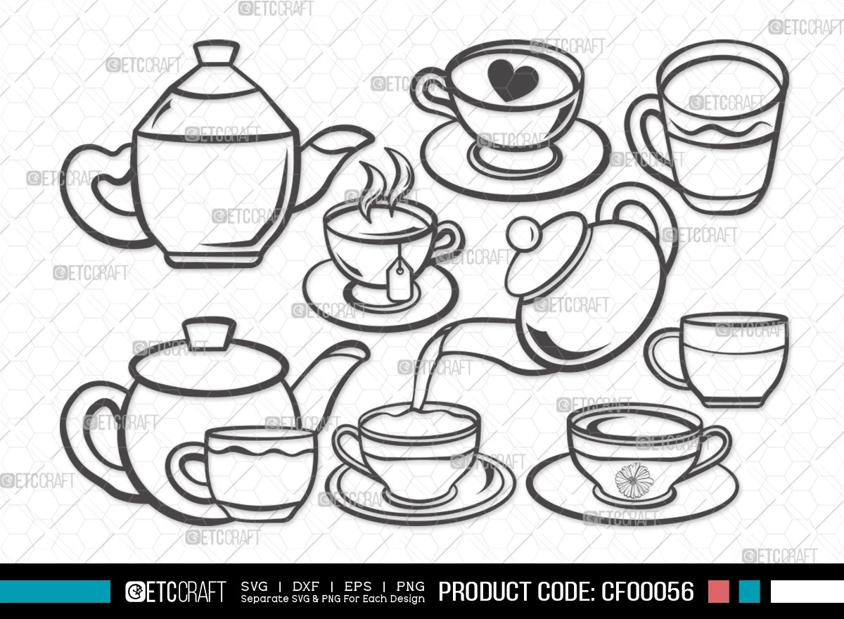 Enhance your tea-themed creativity with our "Tea Set Outline Cup Kettle & TeaPot" SVG cut file bundle. Infuse your projects with a touch of elegance and charm using these versatile and customizable outline designs.