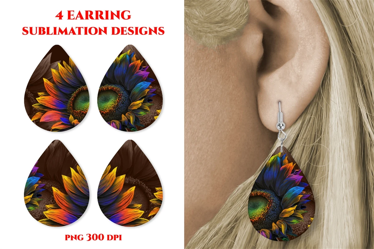4 Earring sublimation designs is small bundle of earring template with rainbow sunflower. This bundle contains designs so that you can create either identical design earrings, or you can mix designs