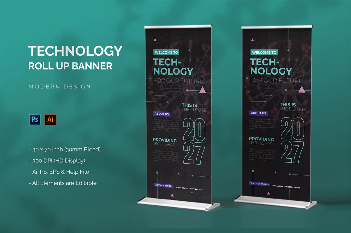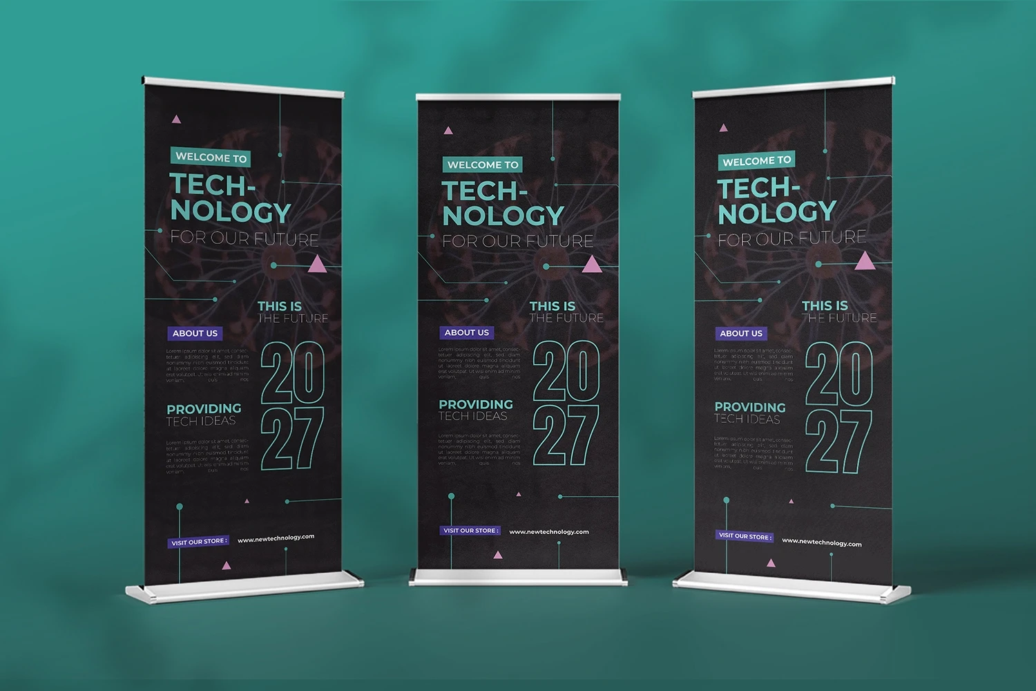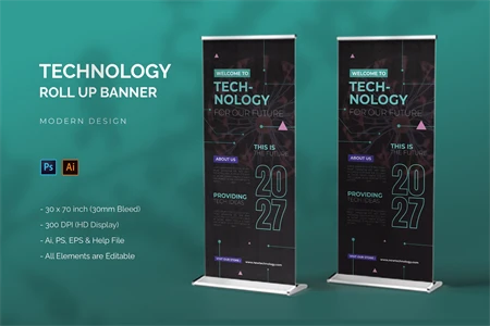 This is **Technology - Roll Up Banner** Don't wait, get it right now! , All Your Roll-Up Banner Needs, Professional or Personal. This stylish and adaptable template is perfect for your company's promotional materials.